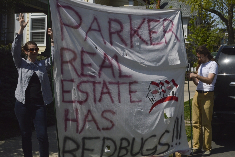 Vanden Dries held a sign with other protesters that read, “PARKER REAL ESTATE HAS BEDBUGS.”