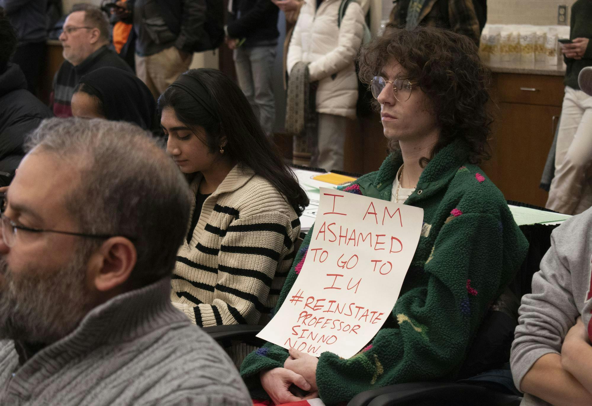 Students sat in the audience and lined the walls of Presidents Hall to watch Shrivastav’s address; one held a Palestinian flag while another displayed a sign that read “I am ashamed to go to IU #Reinstate Prof. Sinno now.”