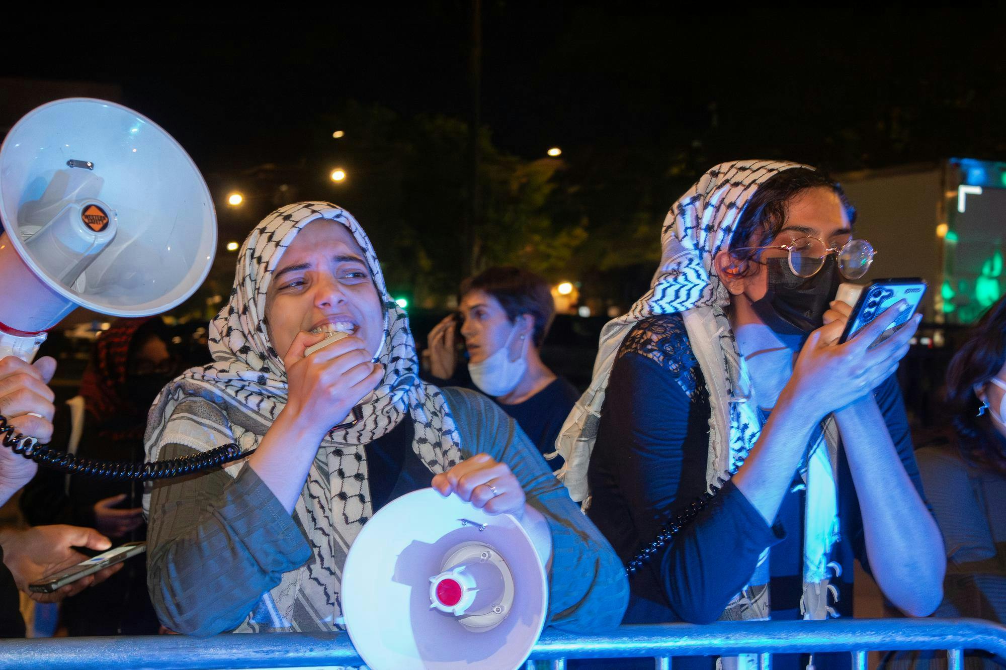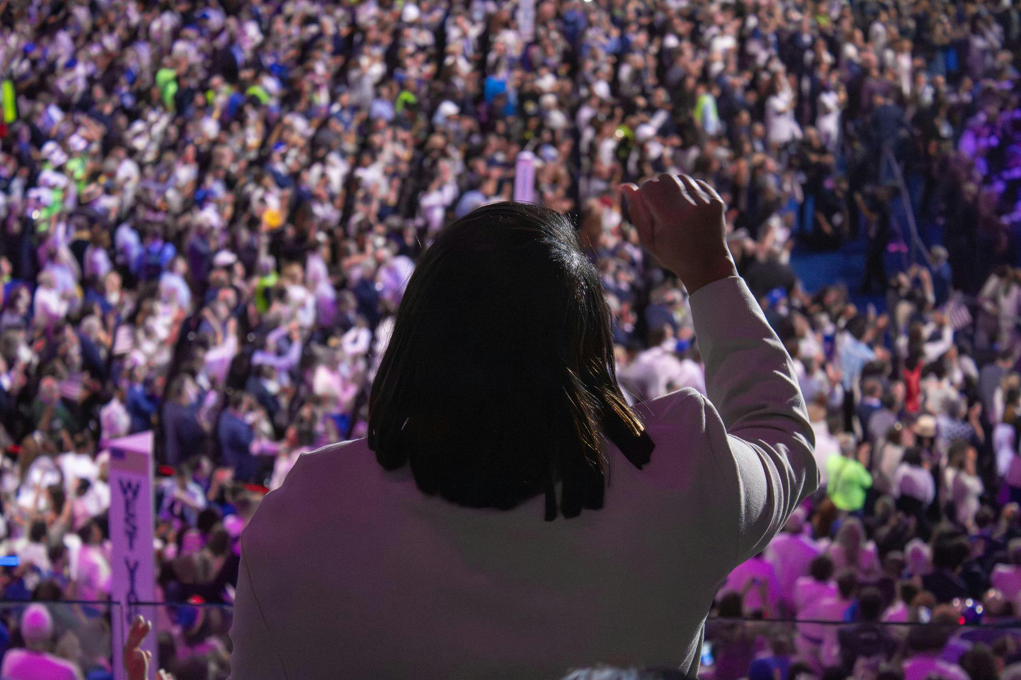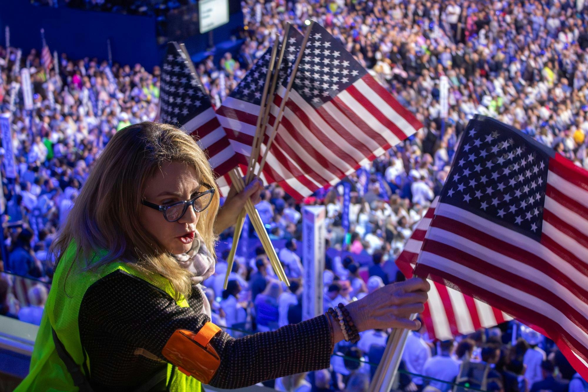 Audience members hold their hands over their hearts during the Pledge of Allegiance during the Democratic National Convention on Aug. 22, 2024, at the United Center in Chicago. A sixth grader from California led the pledge. An audience member listens to a speech during the Democratic National Convention on Aug. 22, 2024, at the United Center in Chicago. The speaker, who shared that she had a miscarriage, said doctors told her to expect a stillbirth. A woman stands in support of speakers at the Democratic National Convention on Aug. 22, 2024, at the United Center in Chicago. Speakers from the final night of the convention included Michigan Gov. Gretchen Whitmer and actress Eva Longoria. The Chicks perform the national anthem during the Democratic National Convention on Aug. 22, 2024, at the United Center in Chicago. The Chicks were previously known as The Dixie Chicks and changed their name in 2020. A delegate, who is a part of the Uncommitted National Movement, stands outside the entrance to her seat during the Democratic National Convention on Aug. 22, 2024, inside the United Center in Chicago. The group led sit-ins during the convention this week to protest the Israel-Hamas War. A woman listens to a parent, who lost her daughter in a shooting at Robb Elementary School in Uvalde, Texas, speak during the Democratic National Convention on Aug. 22, 2024, at the United Center in Chicago. A teacher who survived a shooting in 2012 at Sandy Hook Elementary School also shared her story. Pink performs at the Democratic National Convention on Aug. 22, 2024, at the United Center in Chicago. Pink performed her song "What About Us." A volunteer hands flags to people in the crowd during the Democratic National Convention on Aug. 22, 2024, at the United Center in Chicago. The volunteers passed out three different signs to the crowd on Thursday night. An American flag waves during the Democratic National Convention on Aug. 22, 2024, inside the United Center in Chicago. Volunteers handed flags out to the crowd before Vice President Kamala Harris took the stage. A volunteer sings along to a song during the Democratic National Convention on Aug. 22, 2024, at the United Center in Chicago. Volunteers handed out signs and helped people find their seats. Balloons fall from the ceiling during the Democratic National Convention on Aug. 22, 2024, inside the United Center in Chicago. Event organizers dropped the balloons after Kamala Harris finished her speech. Chicago police officers line up in front of protesters Aug. 22, 2024, outside the United Center in Chicago. Protesters lined up around the United Center's exit and security perimeter during the fourth night of the convention. Protesters read the names of children killed during the Israel-Hamas War in Gaza on Aug. 22, 2024, outside the United Center in Chicago. Protesters lined the United Center's the security perimeter during the fourth day of the Democratic National Convention.