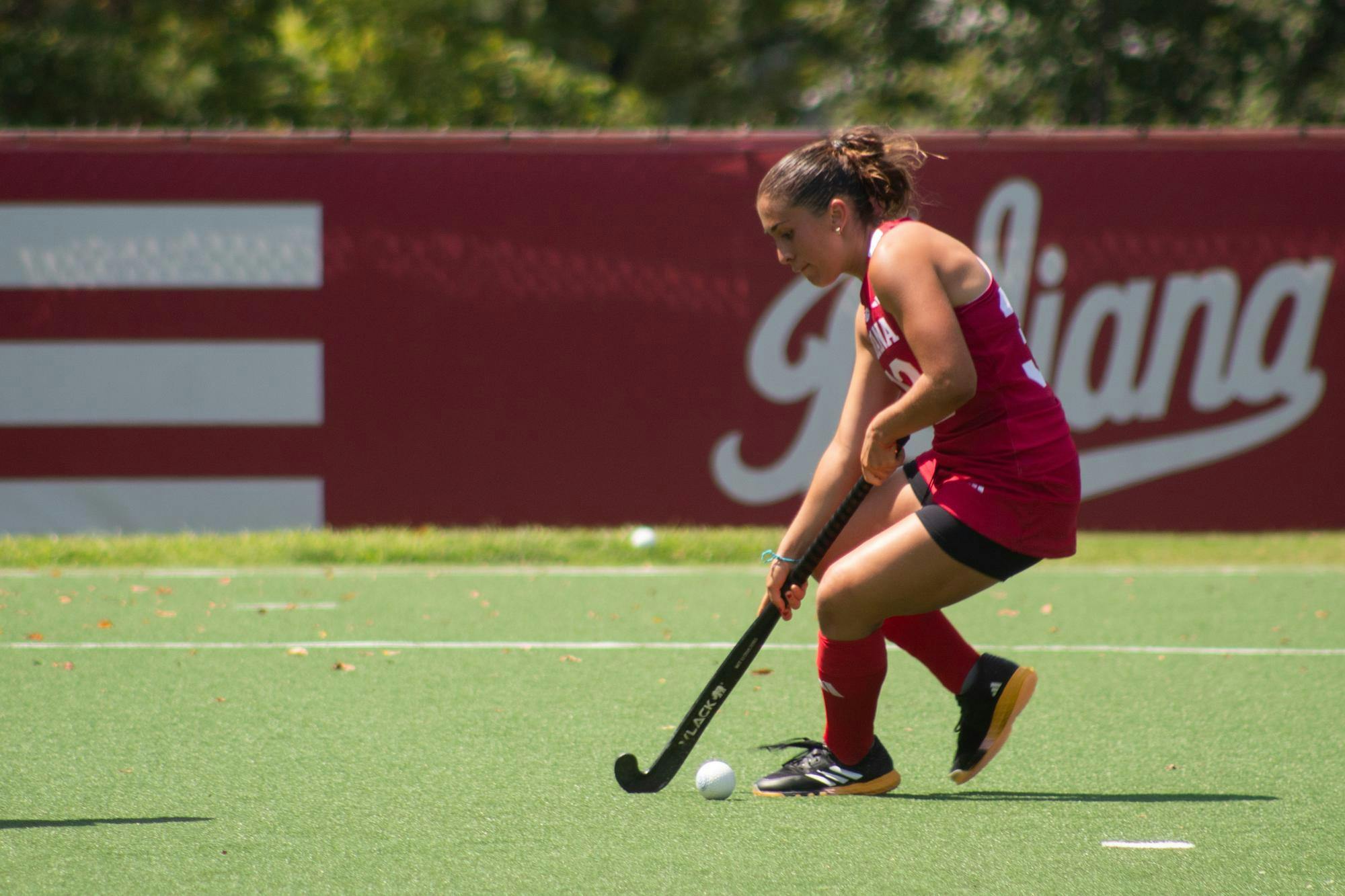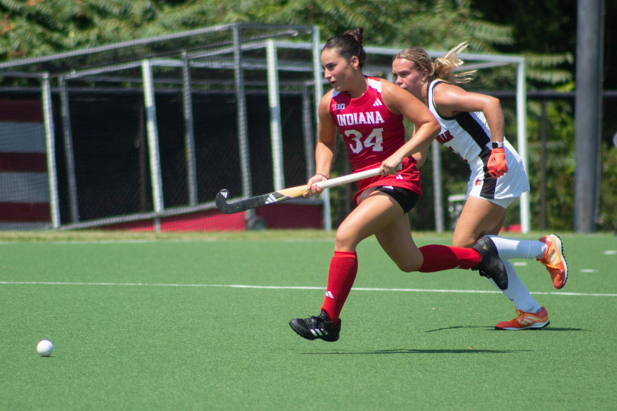 Graduate student midfielder Lara Motz fights for the ball against the University of Louisville Aug. 25, 2024, at Deborah Tobias Field in Bloomington. Indiana opened its season with a victory over Kent State University and then an overtime loss against Liberty University. Graduate student defensive back Sydney Keld hits the ball against Louisville University Aug. 25, 2024, at Deborah Tobias Field in Bloomington. The Hoosiers defeated the Cardinals during an exhibition game. Senior midfielder Maggie Carter fights Louisville University's Mia Duchars for the ball Aug. 25, 2024, at Deborah Tobias Field in Bloomington. Since she began her college career, Carter has appeared in all of the games the team has played. An Indiana field hockey player runs down the field with the ball Aug. 25, 2024, at Deborah Tobias Field in Bloomington. At half time, Indiana defeated Louisville 3-2. Sophomore midfielder Inés Garcia Prado chases after the ball Aug. 25, 2024, at Deborah Tobias Field in Bloomington. Garcia Prado started in all 19 games the team played last year. Junior defensive back Kylie Dawson runs alongside a Louisville University player Aug. 25, 2024, at Deborah Tobias Field in Bloomington. The game ended in a tie, causing it to go into overtime. Sophomore forward Ava Winner and freshman forward Mijntje Hagen run down the field Aug. 25, 2024, at Deborah Tobias Field in Bloomington. The game went into overtime before eventually going into penalty shootouts. Freshmen goalkeeper Sadie Canelli defends the goal Aug. 25, 2024, at Deborah Tobias Field in Bloomington. Canelli had 132 saves during her high school career. Freshman forward Iman Aicha Tabbia Marzocca takes her turn in the overtime shootouts Aug. 25, 2024, at Deborah Tobias Field in Bloomington. The Hoosiers defeated the Cardinals in overtime.