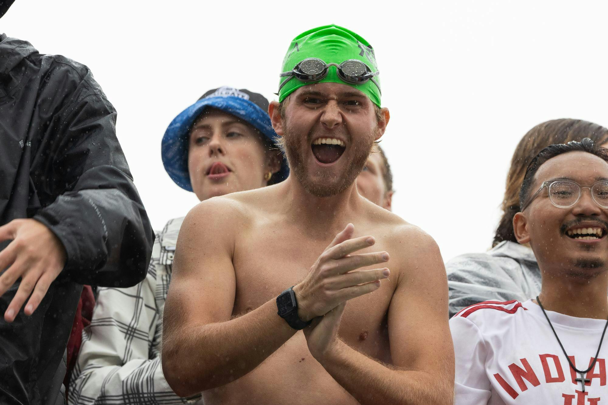 An Indiana fan plays cornhole Sept. 28, 2024, at the tailgating fields in Bloomington. Lots of fans at the tailgate fields brought ponchos and umbrellas to keep dry. An Indiana fan plays beersbee Sept. 28, 2024, at the tailgating fields in Bloomington. In his email to students, head football coach Curt Cignetti told students, "The tailgates can wait," encouraging students to come into the stadium and support the team. An IU fan holds an umbrella while tailgating Sept. 28, 2024, outisde Memorial Stadium in Bloomington. Fans still showed up to tailgate before the Indiana versus Maryland game despite the weather. The IU student section is seen at the IU versus Maryland game on Sept. 28, 2024, at Memorial Stadium in Bloomington. The student section was filled top to bottom by the third quarter of the game. IU fans cheer on the team during the IU versus Maryland game on Sept. 28, 2024, at Memorial Stadium in Bloomington. Head coach Curt Cignetti wrote a letter telling students, "If you need to study, that can wait too," trying to get more students to come support the team. The Indiana student section cheers on the Hoosiers in a game against Maryland on Sept. 28, 2024, at Memorial Stadium in Bloomington. The Hoosiers defeated the Terrapins 42-28. An IU fan holds up her baby Sept. 28, 2024, at Memorial Stadium in Bloomington. The fan was trying to get her baby on the big screen for the "Simba Cam." Hoosier fans cheer on the IU football team Sept. 28, 2024, at Memorial Stadium in Bloomington. After the Hoosiers won the game, head football coach Curt Cignetti sent another email to students thanking them for showing up and asking them to do the same the next time the team plays at home. An IU fan sings during the IU versus Maryland game on Sept. 28, 2024, at Memorial Stadium in Bloomington. The student was singing along to Journey's "Don't Stop Believin." IU fans record themselves celebrating IU's win over Maryland on Sept. 28, 2024, at Memorial Stadium in Bloomington. The student section was packed top to bottom until the game was over. IU fans yell into one the camera of one of their phones during the IU versus Maryland game on Sept. 28, 2024, at Memorial Stadium in Bloomington. Hoosier fans recorded themselves celebrating as the clock was winding down. The Indiana student section is pictured during the IU versus Maryland game on Sept. 28, 2024, at Memorial Stadium in Bloomington. "We need you there in the stands being loud for the first quarter," head coach Curt Cignetti said in his letter to students, "and most importantly, in the fourth." An IU student celebrates the Hoosiers win over Maryland on Sept. 28, 2024, at Memorial Stadium in Bloomington. IU students cheered "Hoosier Daddy" as Indiana gained the lead on Maryland. An IU fan wearing a swim cap and goggles celebrates Indiana's win over Maryland on Sept. 28, 2024, at Memorial Stadium in Bloomington. After the game, Indiana players ran over to the student section to high five the spectators.