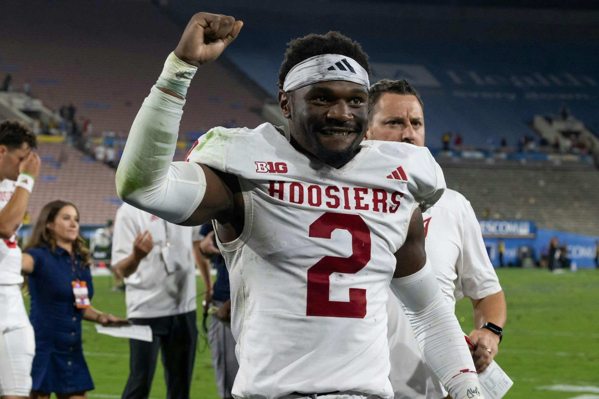 Redshirt freshman kicker Nicolas Radicic celebrates a field goal during a game against UCLA on Sept. 14, 2024, at the Rose Bowl Stadium in Pasadena, California. Radicic only played in one game last year. Senior quarterback Kurtis Rourke throws the ball during a game against UCLA on Sept. 14, 2024, at the Rose Bowl Stadium in Pasadena, California. Rourke transferred to Indiana this year. Redshirt sophomore wide receiver Omar Cooper Jr. scores a touchdown during a game against UCLA on Sept. 14, 2024, at the Rose Bowl Stadium in Pasadena, California. Cooper scored Indiana's fourth touchdown of the game. Sophomore defensive back Amare Ferrel jumps into the air during a game against UCLA on Sept. 14, 2024, at the Rose Bowl Stadium in Pasadena, California. Ferrel transferred to IU this year. Indiana football head coach Curt Cignetti walks along the sideline during a game against UCLA onSept. 14, 2024, at the Rose Bowl Stadium in Pasadena, California. This was Cignetti's third game as IU football's head coach. Senior quarterback Kurtis Rourke throws the ball during a game against UCLA on Sept. 14, 2024, at the Rose Bowl Stadium in Pasadena, California. Rourke threw four touchdowns during Saturday's game. An Indiana fan holds up an IU flag during a game against UCLA on Sept. 14, 2024, at the Rose Bowl Stadium in Pasadena, California. Many Hoosiers travelled across the country to watch IU face UCLA. IU redshirt junior defensive back Jamier Johnson tackles UCLA redshirt senior wide receiver Logan Loya during a game against UCLA on Sept. 14, 2024, at the Rose Bowl Stadium in Pasadena, California. Johnson played for the University of Texas before transferring to Indiana last year. UCLA redshirt senior quarterback Ethan Garbers throws the ball during a game against Indiana on Sept. 14, 2024, at the Rose Bowl Stadium in Pasadena, California. Saturday's game was the first time the Hoosiers ever faced the Bruins. Redshirt sophomore offensive lineman Bray Lynch celebrates a touchdown with senior wide receiver Miles Cross during a game against UCLA on Sept. 14, 2024, at the Rose Bowl Stadium in Pasadena, California. Senior quarterback Kurtis Rourke threw the touchdown. Indiana players run off the field in celebration of their win over UCLA on Sept. 14, 2024, at the Rose Bowl Stadium in Pasadena, California. The Hoosiers defeated the Bruins 42-13. Redshirt senior defensive back Josh Sanguinetti, sophomore defensive back Amare Ferrell and redshirt sophomore defensive back Jamari Sharpe run off the field after a game against UCLA on Sept. 14, 2024, at the Rose Bowl Stadium in Pasadena, California. The players ran back to the bench and behind the field goal to give fans high fives. Indiana fans cheer as the team leaves the field after its matchup against UCLA on Sept. 14, 2024, at the Rose Bowl Stadium in Pasadena, California. Once UCLA fans started to leave toward the end of the game, Hoosier fans moved closer to each other. Senior linebacker Jalin Walker holds his fist in the air as he walks off the field after Indiana's game against UCLA on Sept. 14, 2024, at the Rose Bowl Stadium in Pasadena, California. Walker had just finished an interview with the Big 10 Network when he left the field. Hoosier fans cheer as IU football players leave the field after their win over UCLA on Sept. 14, 2024, at the Rose Bowl Stadium in Pasadena, California. As the players ran off the field, many high fived fans. Redshirt junior defensive back JoJo Johnson greets fans after Indiana's game against UCLA onSept. 14, 2024, at the Rose Bowl Stadium in Pasadena, California. As IU players left the field, most threw their towels to fans.
