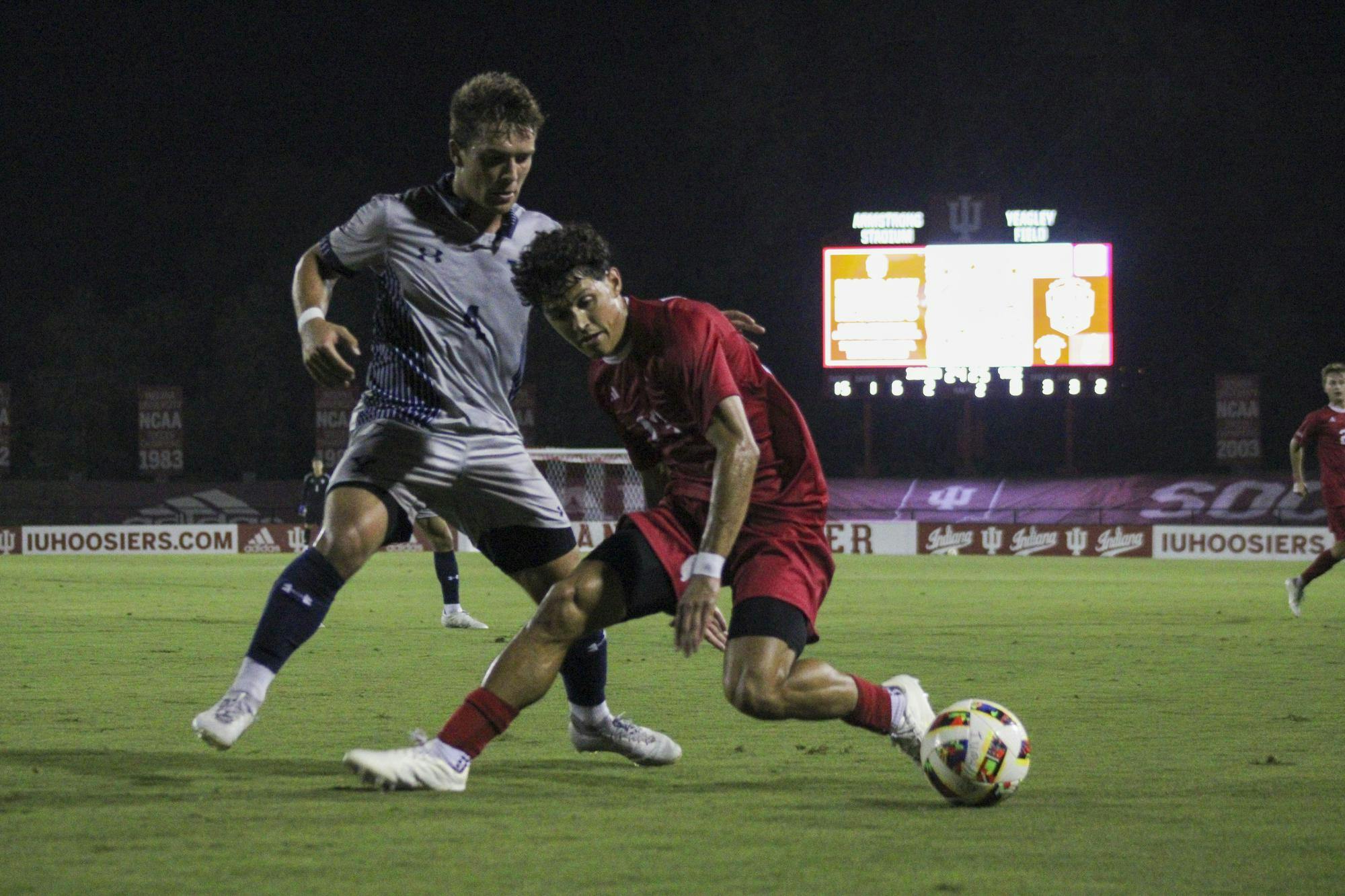 The Indiana men's soccer team huddles before a match against Yale University Sept. 1, 2024, at Bill Armstrong Stadium in Bloomington. The Hoosiers defeated the Bulldogs 2-0. Indiana University marching band stands in front of the sunset during a men's soccer match against Yale University Sep. 4, 2024, at Bill Armstrong Stadium in Bloomington. The Hoosiers scored their first goal at the 17th minute. Senior forward Tommy Mihalic lines up to take a penalty kick during a match against Yale University Sep. 1, 2024, at Bill Armstrong Stadium in Bloomington. Mihalic scored both goals for the Hoosiers Sunday evening. Members from the Indiana men's soccer team celebrate after a goal from senior forward Tommy Mihalic during a match against Yale Sep. 1, 2024, at Bill Armstrong Stadium in Bloomington. Mihalic scored one goal in each half for the Hoosiers. Senior forward Samuel Sarver (left) and freshman forward Michael Nesci embrace during a match against Yale University Sep. 1, 2024, at Bill Armstrong Stadium in Bloomington. The Hoosiers shut out the Bulldogs Sunday evening. Graduate student forward Justin Weiss and junior midfielder Jack Wagoner attempt to score a goal with the ball in the air during a match against Yale University Sep. 1, 2024, at Bill Armstrong Stadium in Bloomington. The Hoosiers finished the match with 15 total shots with five on goal. A group Indiana men's soccer fans point towards the camera during a match against Yale University Sept. 1, 2024, at Bill Armstrong Stadium in Bloomington. Indiana held Yale to only seven shots in the shutout victory. Sophomore defender Alex Barger makes a hard cut off the ball with a defender on his back during a match against Yale University Sep. 1, 2024, at Bill Armstrong Stadium in Bloomington. Barger finished the match with one shot and three fouls. Redshirt sophomore midfielder Seth Stewart attempts to block a kick during a match against Yale University on Sept. 1, 2024, at Bill Armstrong Stadium in Bloomington. Stewart had one shot on goal during the match. Senior forward Tommy Mihalic celebrates after scoring a goal against Yale University Sep. 1, 2024, at Bill Armstrong Stadium in Bloomington. It was Mihalic's second goal of the night.