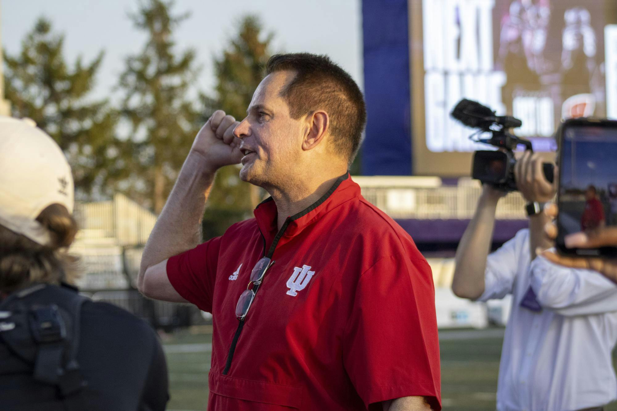 Redshirt sophomore Tayven Jackson stretches before a game against Northwestern University on Oct. 5, 2024, at Lanny and Sharon Martin Stadium in Evanston, Illinois. Jackson had 134 passing yards on the season after the game against Northwestern. Redshirt junior defensive lineman Mikail Kamara hits Northwestern redshirt sophomore quarterback Jack Lausch as he attempts to throw the ball in a game Oct. 5, 2024, at Lanny and Sharon Martin Stadium in Evanston, Illinois. The result of the play was ruled a fumble, before being overturned by replay review. Sixth year senior Kurtis Roarke looks to take the snap in front of the Northwestern University student section during a game Oct. 5, 2024, at Lanny and Sharon Martin Stadium in Evanston, Illinois. Rourke had 380 yards and three touchdowns through the air in the game. The Northwestern University student section is pictured during a game against Indiana University on Oct. 5, 2024, at Lanny and Sharon Martin Stadium in Evansville, Illinois. The reported attendance of the game was 12,023. Redshirt junior defensive back Jamier Johnson tackles a Northwestern player during a game against Northwestern University on Oct. 5, 2024, at Lanny and Sharon Martin Stadium in Evanston, Illinois. Johnson had six total tackles in the game. The northwest end zone seating at Lanny and Sharon Martin Stadium shows a split between Indiana University and Northwestern University fans during a football game Oct. 5, 2024, in Evanston, Illinois. The game kicked off at 2:40 p.m central time. Junior wide receiver Elijah Sarratt struggles with a Northwestern defender Oct. 5, 2024, at Lanny and Sharon Martin Stadium in Evanston, Illinois. Sarratt caught seven passes for 135 yards against the Wildcats. A group of Indiana Hoosier football players, including junior wide receiver Elijah Sarratt, meet on the field after the game against Northwestern University on Oct. 5, 2024, at Lanny and Sharon Martin Stadium in Evanston, Illinois. Sarratt led the Hoosiers in the game with seven receptions for 135 yards. Indiana football head coach Curt Cignetti chants with Indiana fans in the bleachers after a game against Northwestern University on Oct. 5, 2024, at Lanny and Sharon Martin Stadium in Evanston, Illinois. Cignetti started his coaching career at Indiana with a 6-0 record. Indiana football fans cheer, some with their arms in the air, following a football game against Northwestern University on Oct. 5, 2024, at Lanny and Sharon Martin Stadium in Evanston, Illinois. Indiana became the first FBS team to be bowl eligible after its sixth win of the season. A fan in the crowd holds an IU flag in the crowd after football game against Northwestern University on Oct. 5, 2024, at Lanny and Sharon Martin Stadium in Evanston, Illinois. The Hoosiers won both of their two away games, with the first against UCLA on Sept. 14, 2024.
