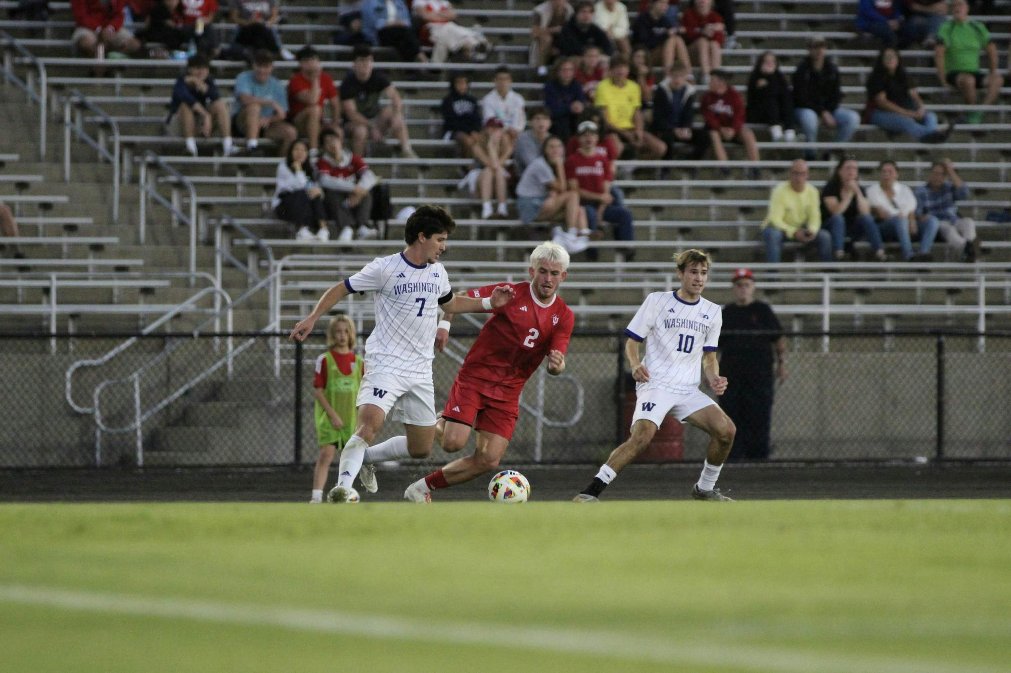 Indiana players race to beat their Washington opponents to the ball during their game Oct. 4, 2024, at Bill Armstrong Stadium in Bloomington. The Hoosiers led at half with two goals. Junior defender Quinton Elliot and senior forward Tommy Mihalic celebrate a goal scored in the game against Washington on Oct. 4, 2024, at Bill Armstrong Stadium in Bloomington. Elliot scored the Hoosiers' two goals of the game. Junior defender Quinton Elliot dribbles the ball against a Washington opponent Oct. 4, 2024, at Bill Armstrong Stadium in Bloomington. The play led to Elliot’s second goal of the game. Indiana University’s Student Athletic Board cheers on the Hoosiers during the men's soccer game against Washington on Oct. 4, 2024 at Bill Armstrong Stadium. The game ended in a tie. Sophomore forward Collins Oduro takes the ball during the game against Washington on Oct. 4, 2024, at Bill Armstrong Stadium in Bloomington. IU had 12 shots on goal in the game. Freshman forward Michael Nesci fights Washington redshirt freshman midfielder Connor Loft to the ball during the game Oct. 4, 2024, at Bill Armstrong Stadium in Bloomington. The Hoosiers tried to break the tied score in the last few minutes of the game.