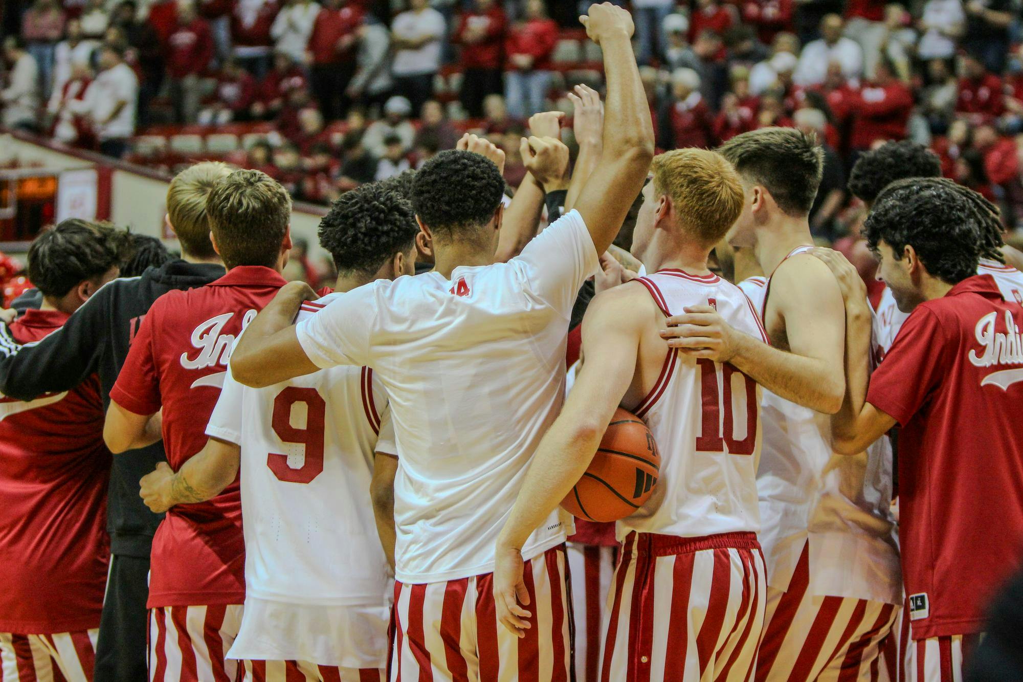 The Indiana men's basketball team meets before a game against South Carolina on Nov. 16, 2024, at Simon Skjodt Assembly Hall in Bloomington. The Hoosiers outscored the Gamecocks in both halves of the 87-71 win. Redshirt sophomore guard Miles Rice holds the basketball and signals to his teammates during a game against South Carolina on Nov. 16, 2024, at Simon Skjodt Assembly Hall in Bloomington. Rice led the Hoosiers in points for the game with 23. Sophomore guard Kanaan Carlyle hangs from the rim during a game against South Carolina on Nov. 16, 2024, at Simon Skjodt Assembly Hall in Bloomington. Carlyle started for the Hoosiers and scored 12 points during the game. Sixth-year senior center Oumar Ballo looks to inbound the basketball during a game against South Carolina on Nov. 16, 2024, at Simon Skjodt Assembly Hall in Bloomington. Ballo played 31 minutes in the game and recorded 13 rebounds. Sophomore forward Mackenzie Mgbako dunks the basketball during a game against South Carolina on Nov. 16, 2024, at Simon Skjodt Assembly Hall in Bloomington. Mgbako had the second most points for the Hoosiers in the game with 17. Fifth-year senior guard Trey Galloway holds the basketball in front of a defender during a game against South Carolina on Nov. 16, 2024, at Simon Skjodt Assembly Hall in Bloomington. Galloway started the game on the bench and scored 11 points. Sixth-year senior Oumar Ballo blocks a shot during a game against South Carolina on Nov. 16, 2024, at Simon Skjodt Assembly Hall in Bloomington. Ballo had six blocks in the game. Indiana men's basketball head coach Mike Woodson signals to his players during a game against South Carolina on Nov. 16, 2024, at Simon Skjodt Assembly Hall in Bloomington. The Hoosiers shot 47.1% from three-point range in the game. Redshirt sophomore guard Myles Rice passes the basketball during a game against South Carolina on Nov. 16, 2024, at Simon Skjodt Assembly Hall in Bloomington. Rice played more minutes than any other Hoosiers with 37. Sixth-year senior center Oumar Ballo shoots a free throw during a game against South Carolina on Nov. 16, 2024, at Simon Skjodt Assembly Hall in Bloomington. Ballo went 5-9 from the free throw line.