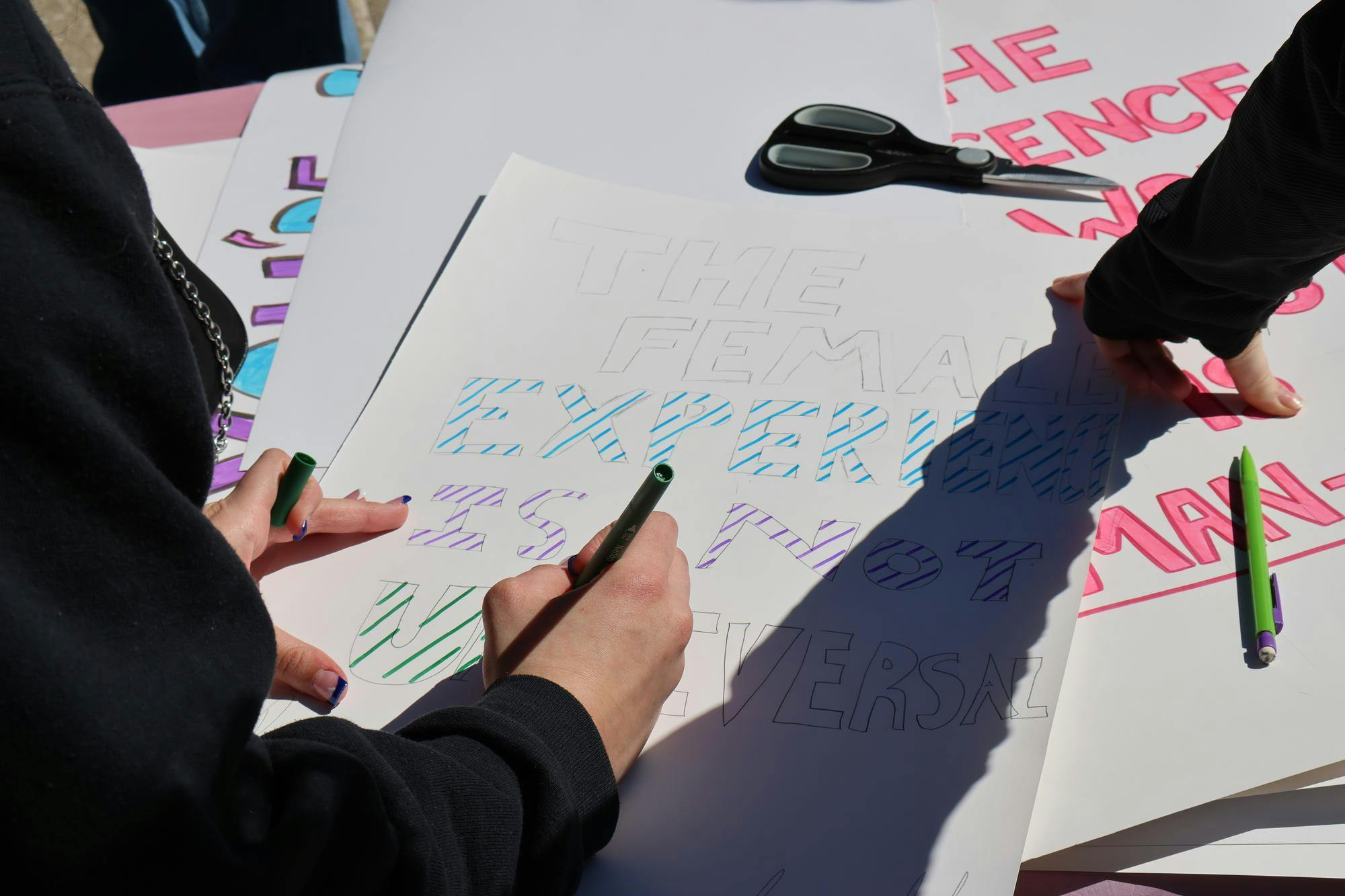 Attendees create signs at the Girl Up at IU booth on Sunday at the IU Women’s March. Multiple clubs offered signs for attendees to make their own.