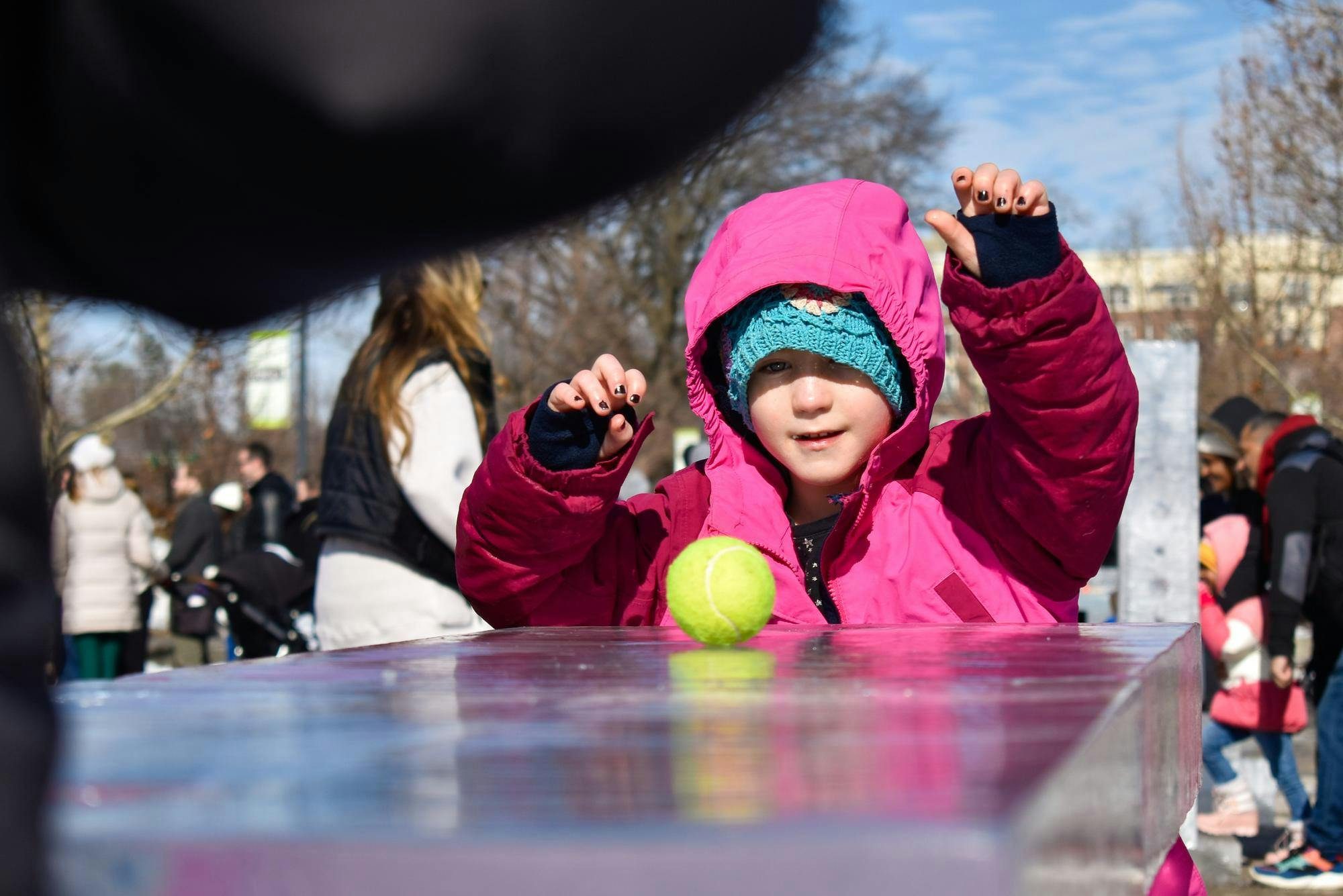 A crowd of Freezefest attendees circle around ice sculptor Dean DeMarais as he shaves a block of ice into a sculpture Jan. 25, 2025, in Bloomington. DeMarais has lived in Dallas, Texas, and has travelled to compete in ice carving events across the country. Dean DeMarais angles a chisel downward to make an incision in an ice block at Freezefest on Jan. 25, 2025, in Bloomington. DeMarais was stationed directly outside of The Mill, creating lots of foot traffic, as he was in the main path of the festival. A girl smiles into a mirror after having her face painted at Freezefest on Jan. 25, 2025, in Bloomington. During the third day of the festival, multiple family-centric events were held indoors in The Mill like face-painting and cookie decorating. Freezefest attendees decorate cookies Jan. 25, 2025, in the Event Hall at The Mill in Bloomington. The Event Hall offered opportunities to warm up, especially for those with younger children. A family poses for a photo at an ice sculpture photo booth while attending Freezefest on Jan. 25, 2025, in Bloomington. Many of the sculptures were around a child’s height and were designed for attendee photo opportunities. A mother pulls her daughter down an ice slide at FreezeFest on Jan. 25, 2025, in Bloomington. The annual winter festival featured ice sculptures, local vendors and family-friendly activities. A woman holding a baby gasps as she watches a toy car slides down an ice ramp at Freezefest on Jan. 25, 2025, in Bloomington. The racing ramp included a variety of toy cars for attendees to choose from. A girl lifts her arms after pushing a tennis ball to her game partner at Freezefest on Jan. 25, 2025, in Bloomington. Freezefest featured multiple popular games in ice form such as corn hole, pickleball and mini-golf. Dean DeMarais leans against his block of ice while carving a sculpture at Freezefest on Jan. 25, 2025, in Bloomington. DeMarais had not had an idea in mind prior to the demonstration and spent several minutes sketching with food coloring and finalizing his vision before finally carving.