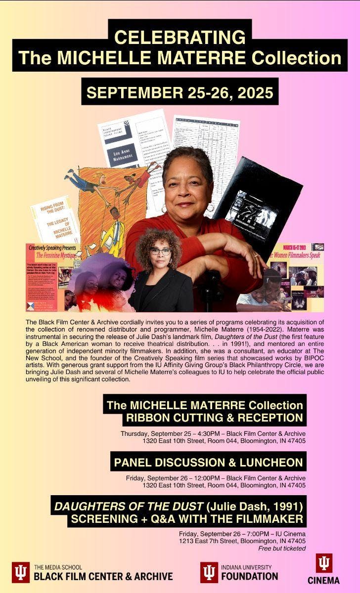 Programming will begin with a ribbon-cutting and reception for the Michelle Materre Collection, hosted at the Black Film Center & Archive (Wells Library 044) at 4:30 p.m. on September 25th. A new exhibition centering Michelle Materre and highlighting materials from the collection will be unveiled as part of the festivities. Students, faculty, and community members are invited to enjoy refreshments, a BFCA tour featuring new collection items, and an opportunity to engage with Julie Dash. No RSVP is required.