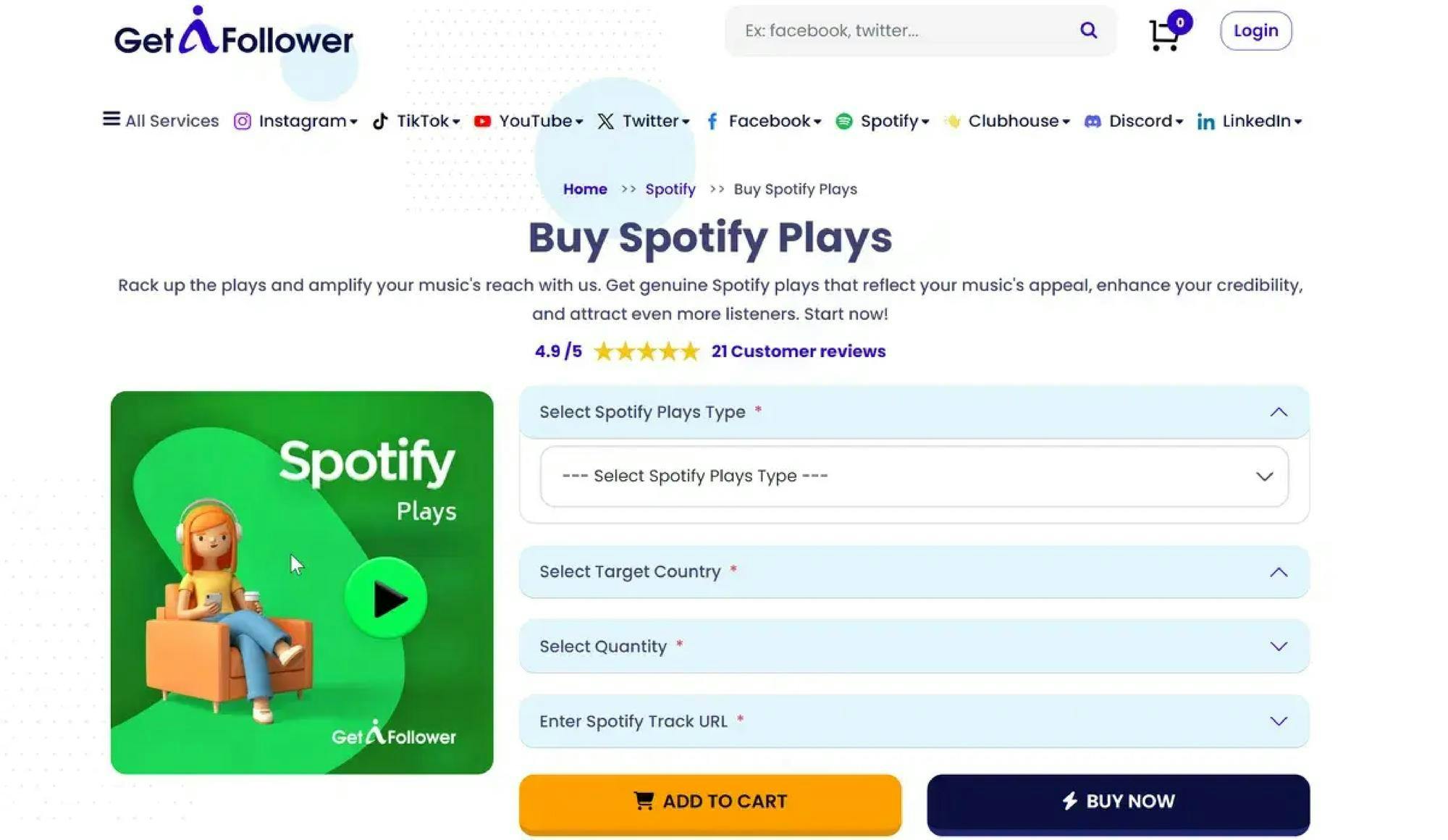 GetAFollower offer affordable Spotify plays plans focus on value and drip feed delivery. The company has worked in social media growth for over 12 years and positions itself as a leader in low cost social signals. On its Spotify plays page, you can choose from several play types inside one form. The selector covers track plays, album plays, playlist plays, and podcast plays, plus special choices like Premium, Algorithmic, Editorial, Chart, and Google Ads plays.