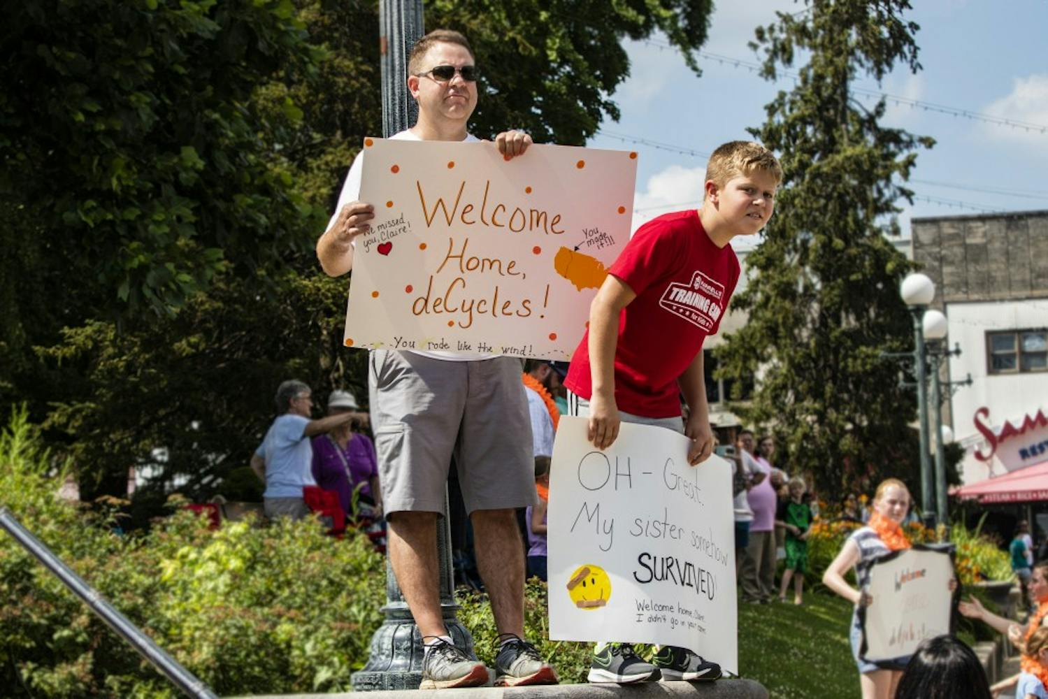 Family and friends welcomed home 46 deCycles riders at 4 p.m. Sunday from a 25 day-long trip from Arizona to Montana. People brought posters to celebrate the riders in front of the Monroe County Courthouse.