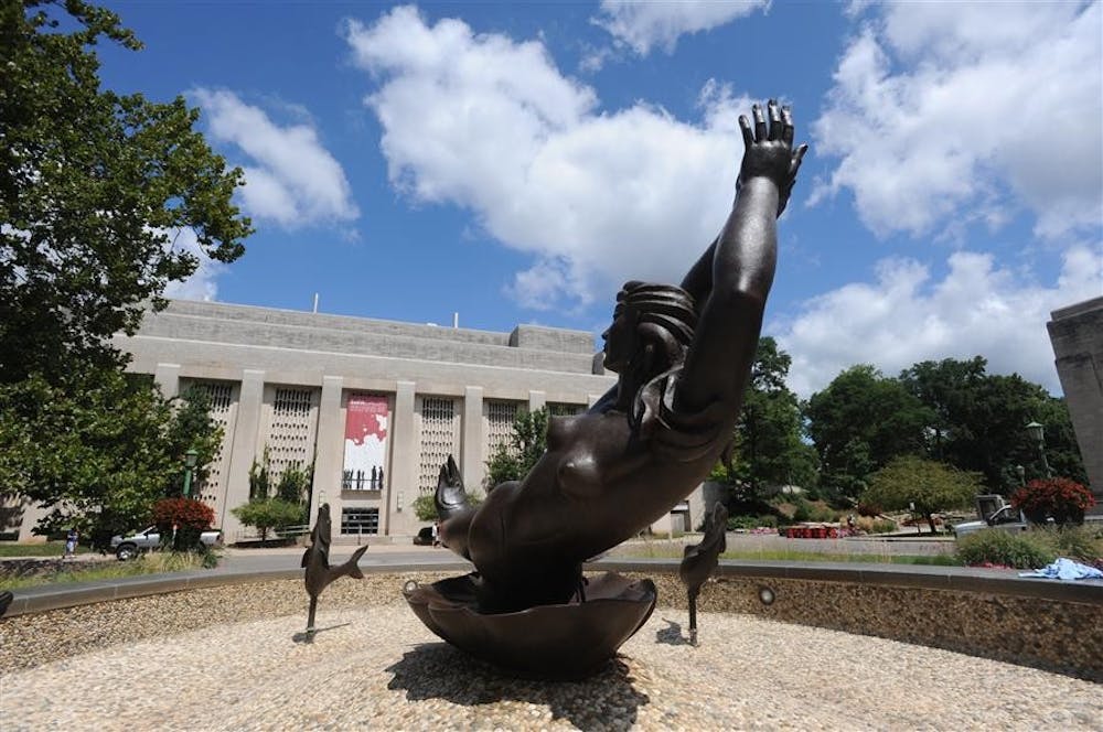 The sculpture that makes up Showalter Fountain shows goddess Venus being born from a clam shell. Venus, the goddess of love and beauty, is surrounded by five fish. Stephanie Haberman