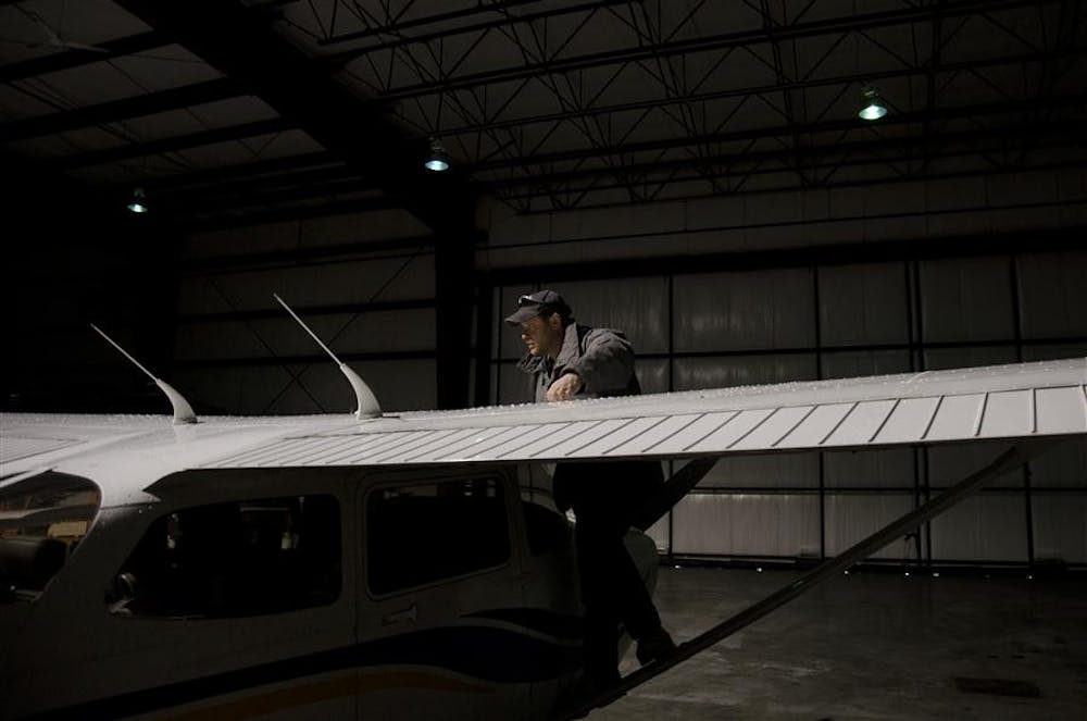 Matt Laherty, a student at the BMG Aviation flight school, examines the wing of a 1999 Cessna 172S in the BMG hangar on Saturday morning. Laherty has invested ten thousand dollars in the training, and is one week away from the Federal Aviation Administration test, which could earn him his private pilot license.