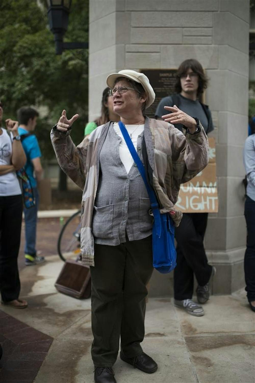 International Studies professor Stephanie Kane speaks during a protest Wednesday at the Sample Gates. The protest centered around the 50 Physical Plant employees that will no longer be employed by IU. Matailong Du