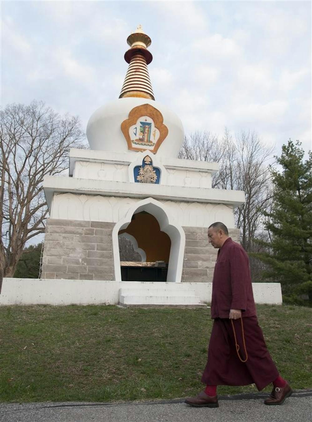 Geshe Lobsang Kunga walks around the Kalachakra Stupa while saying a mantra on the grounds of the Bloomington Tibetan Mongolian Buddhist Cultural Center. Geshe Kunga first came to the United States in 2001 with a tour group in Washington D.C. Several years later in 2009, he came back to the United States, eventually coming to Bloomington.