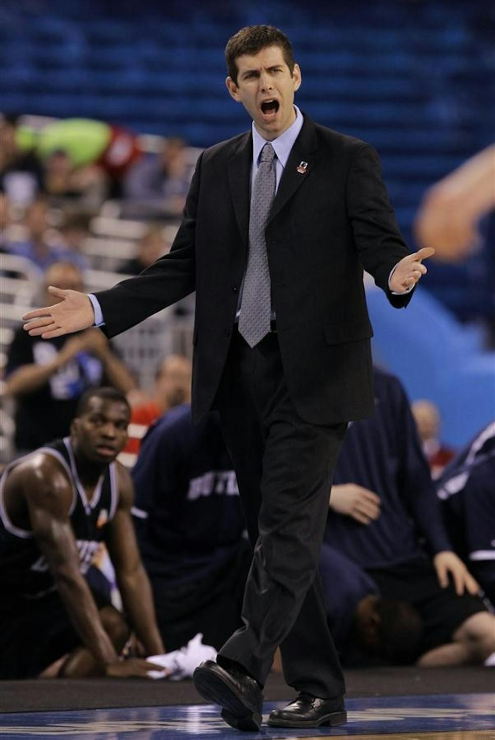 Butler head coach Brad Stevens reacts during the first half of the men's NCAA Final Four college basketball championship game against Duke Monday. Alex Pappas