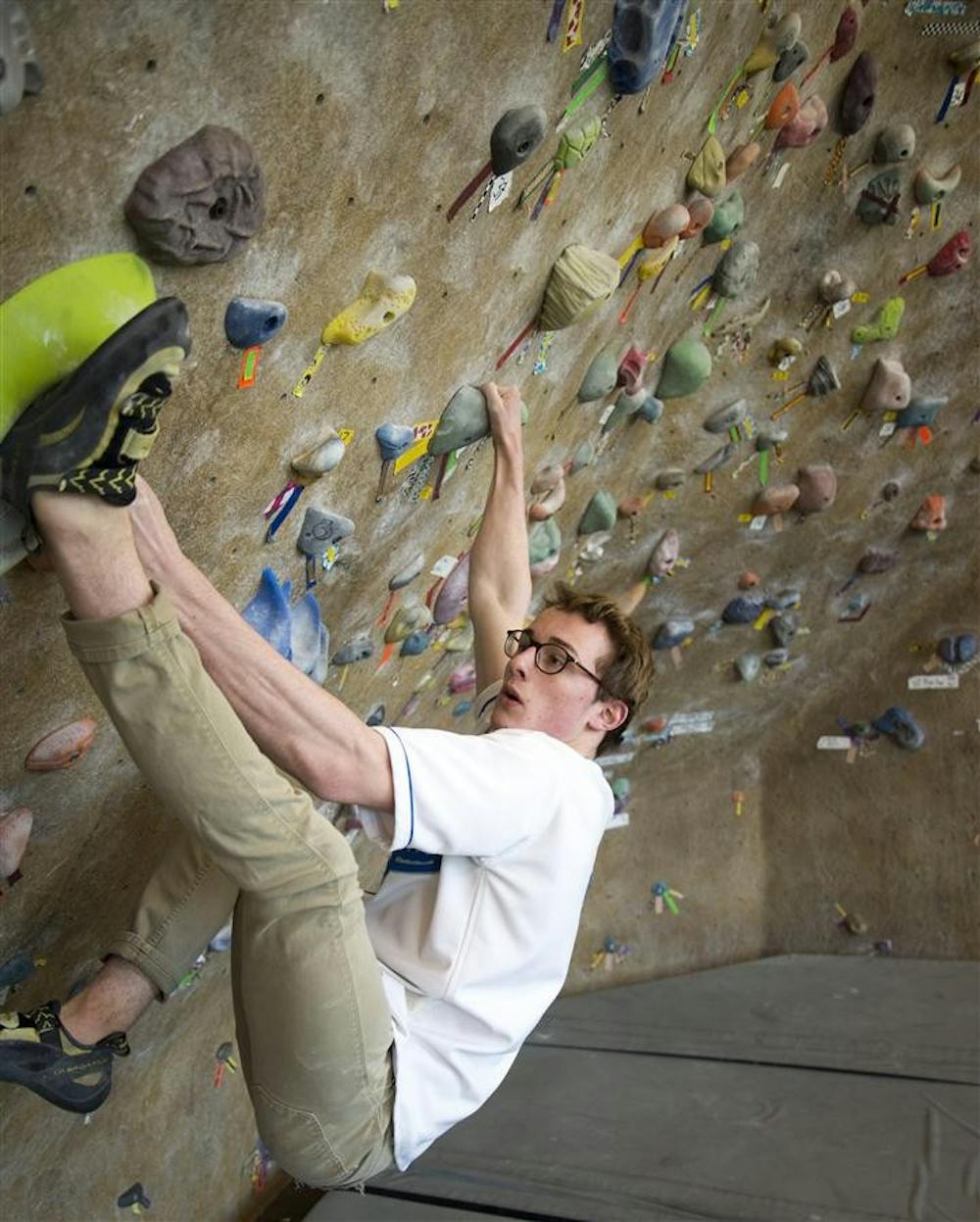 Freshman Alec Mandla tests his climbing skills midday Thursday at the IU Outdoor Adventures bouldering wall on the bottom floor of Eigenmann Hall. The wall measures nearly 1,000 square feet across three walls up to 11 feet high.