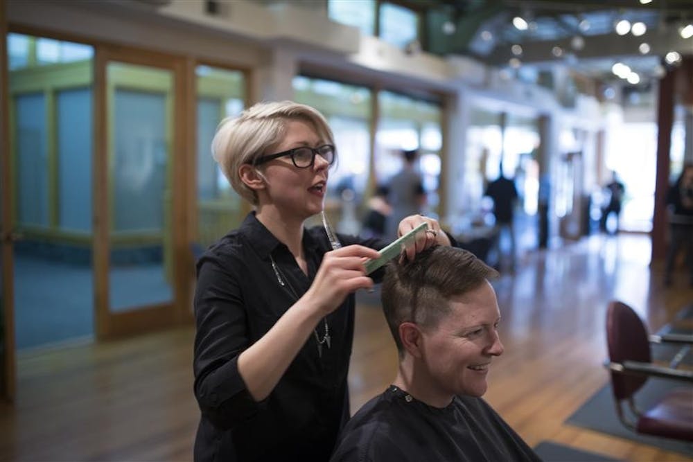 Stylist and owner of Royale Hair Parlor Bridgett Vohland styles a customer's hair to benefit Bloomington PRIDE on Sunday. Stylists from local salons gathered in Royale Hair Parlor to donate their time. Matailong Du