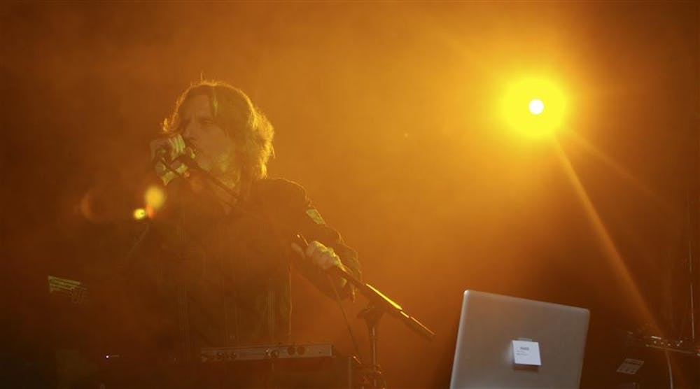 Rock history professor Andy Hollinden stands at the microphone during a show at the Monroe County Fall Festival on Friday in Ellettsville. Hollinden and his band, Atom Heart Mother, performed Pink Floyd's album "Dark Side of the Moon" from start to finish.