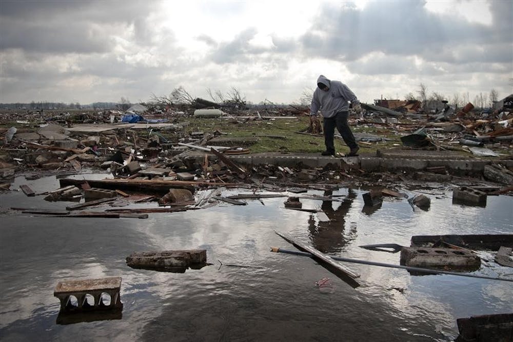 Richard Ewing looks for his cousin Tammy's jewelry box in the flooded foundation where their home used to stand Saturday in Marysville, Ind. Mark Felix