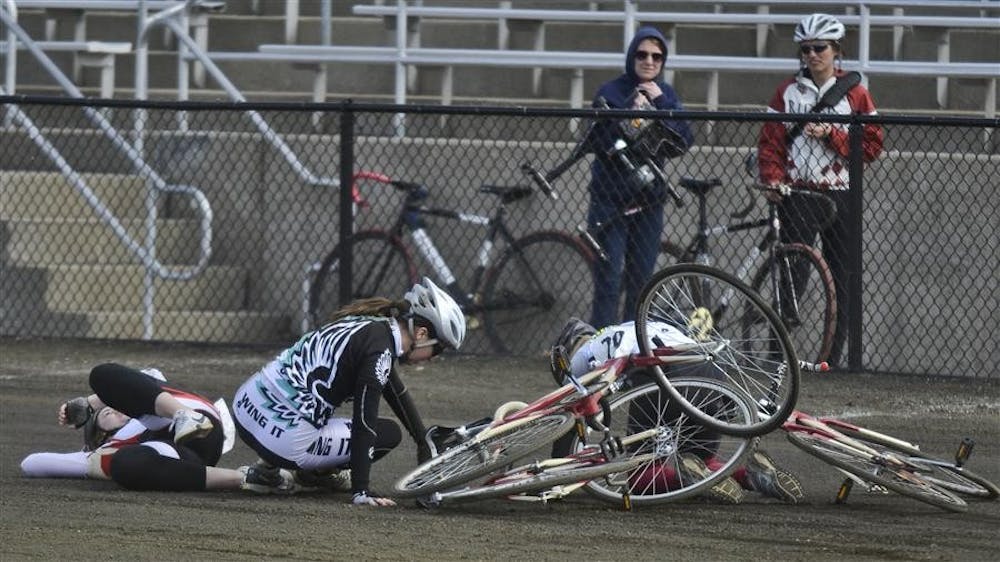 An Army Women's rider, an Alpha Gamma Delta rider, and a Wing It rider pick themselves up after a crash during the Little 500 Miss-N-Out event on Saturday at Bill Armstrong Stadium. Sam Park