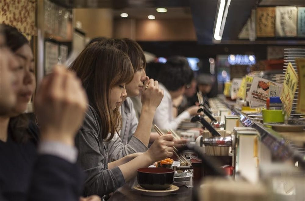 Patrons enjoy sushi at Sushi-Daidokoya in Shibuya, Tokyo. The restaurant featured a conveyor belt that carried food and advertised specials to customers. Caitlin O'Hara