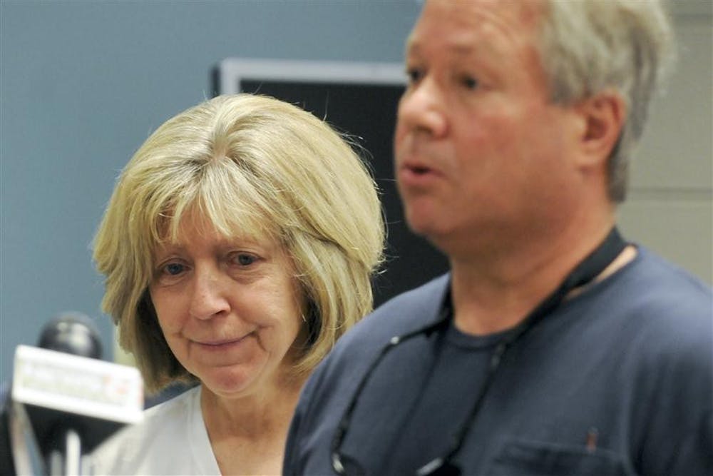 Charlene Spierer listens to her husband, Robert, give a statement to the media during a press briefing on the fourth day of searches for their daughter, Lauren Spierer, on Tuesday at Bloomington Police Department headquarters.