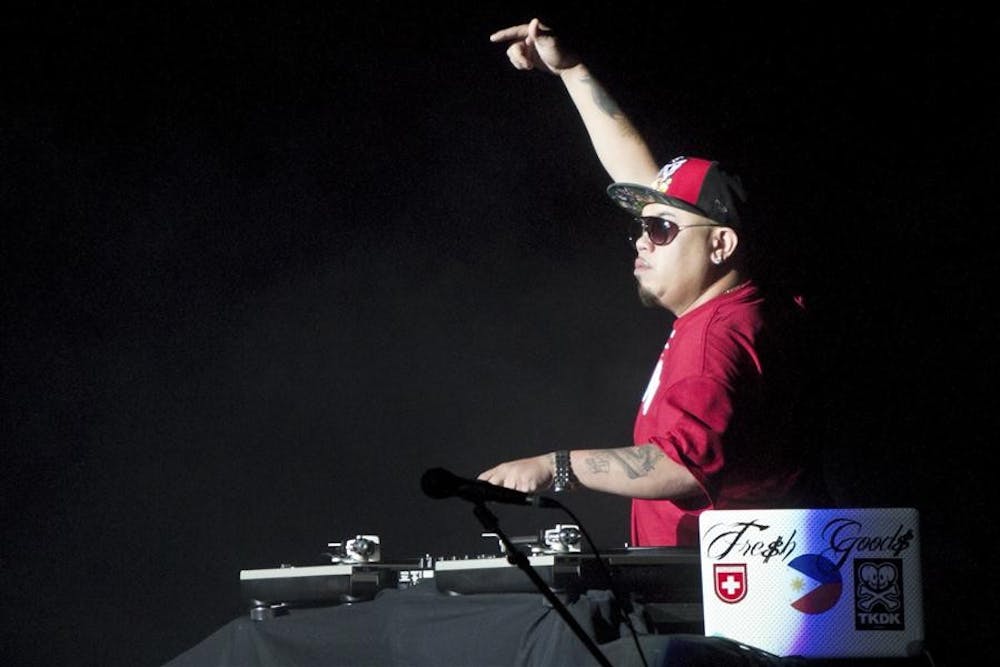 A DJ greets the crowd during the Sublime with Rome show Friday at the IU Auditorium.