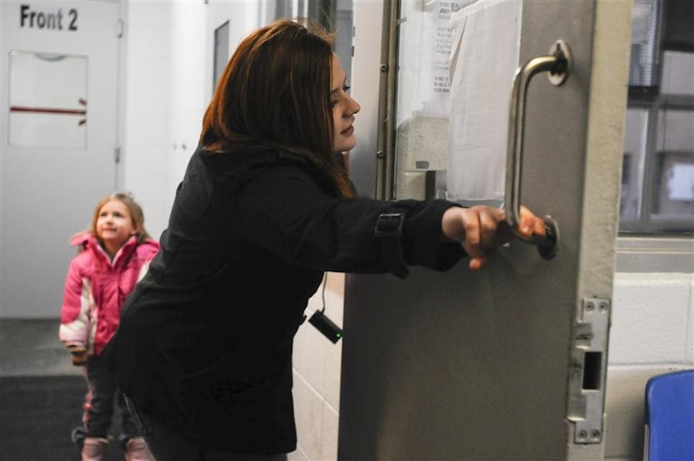 Brittney Hamm closes the Front 1 door before talking to her fiance, Jere, on Monday in the Monroe County Correctional Facility. Jere was arrested seven months ago and charged with theft on the IU campus.