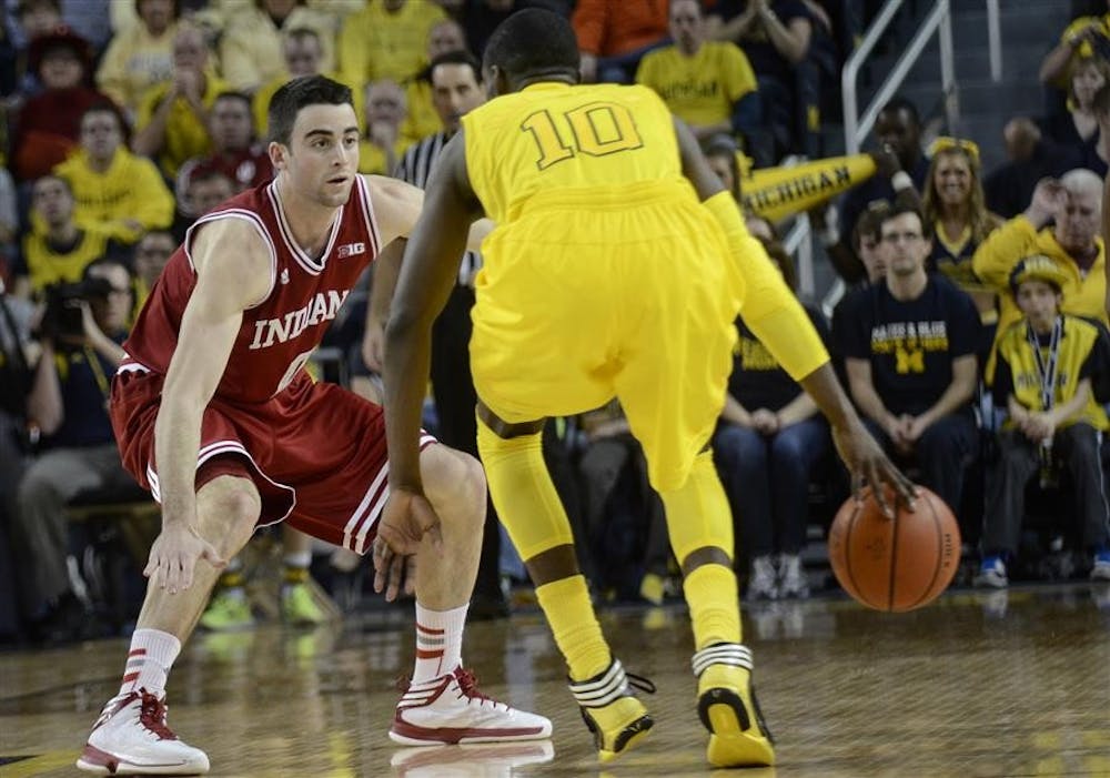 Junior forward Will Sheehey defends Michigan player Tim Hardaway Junior during IU's 72-71 win against Michigan on Sunday at Crisler Center in Ann Arbor, Mich.