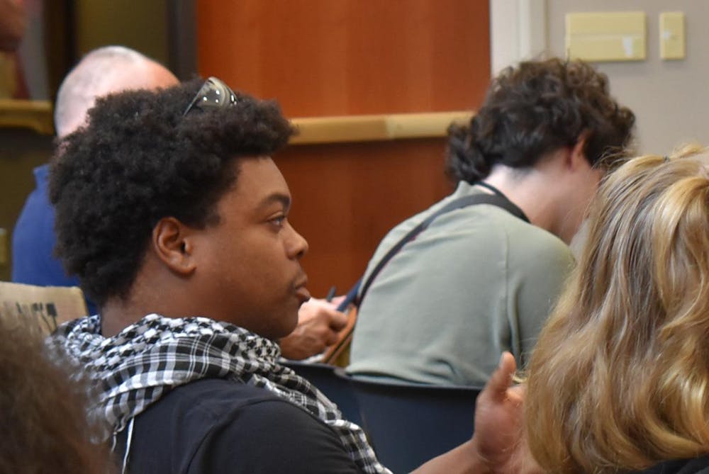 Bryce Greene, an organizer of the pro-Palestine encampment in Dunn Meadow, attends an IU Board of Trustees on July 29, 2024, in the Showalter House in Bloomington.
