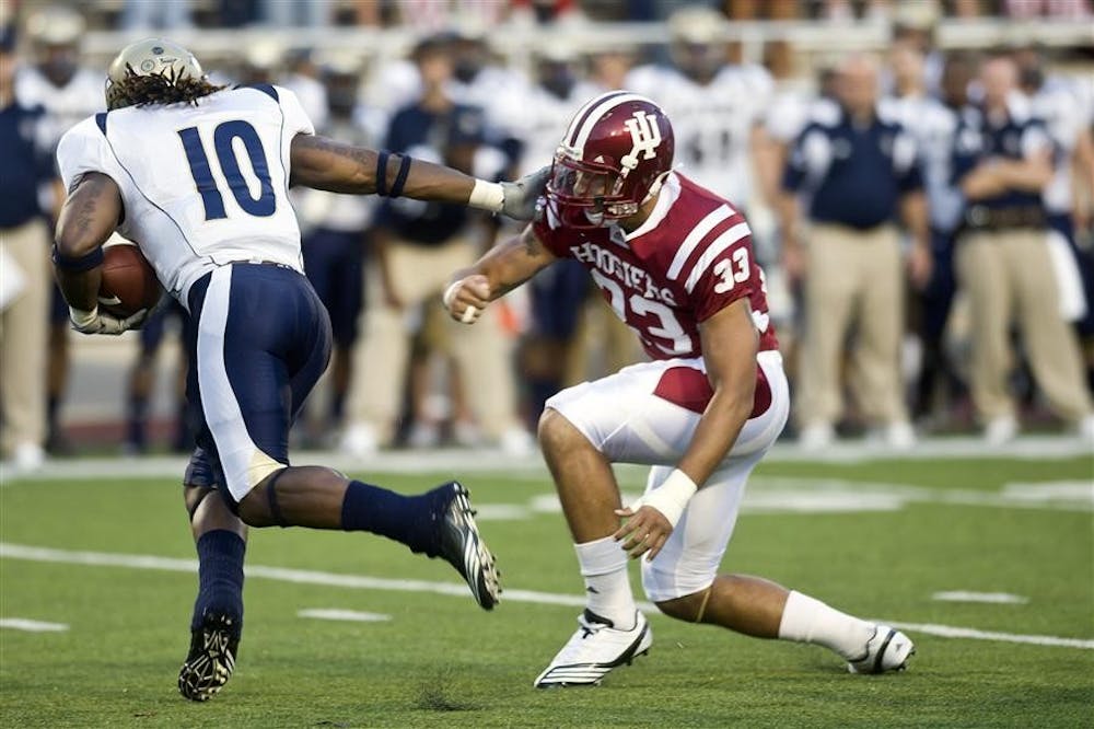 Akron running back Alex Allen stiff-arms freshman linebacker Damon Sims during IU's 35-20 win against Akron on Saturday at Memorial Stadium. The Hoosiers allowed 160 rushing yards to the Zips, who averaged 115.3 yards per game entering the game.