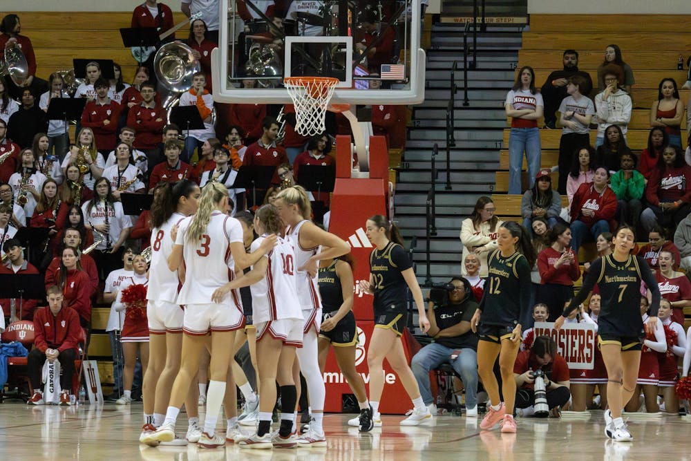 Members of IU's women's basketball team huddle on the court during the game against Northwestern on Feb. 1, 2026, at Simon Skjodt Assembly Hall in Bloomington. The Hoosiers beat the Wildcats 89-75.