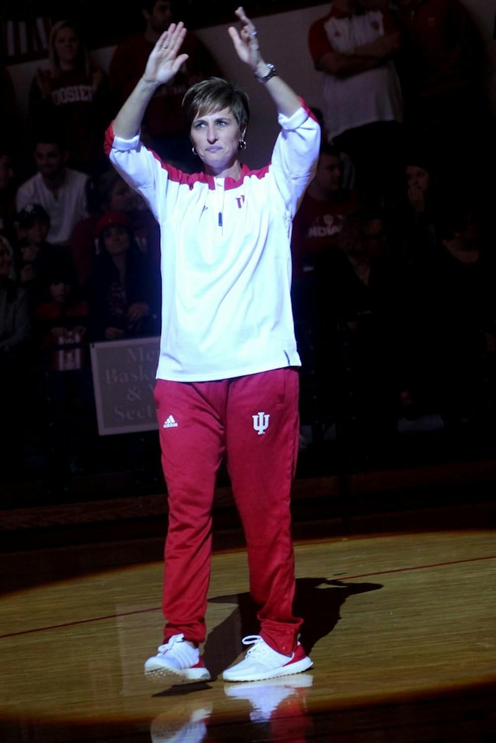Head Coach Teri Moren dances onto the court after being introduced with her team. Moren is entering her third year as head coach at IU. Matt Rasnic and Matt Rasnic