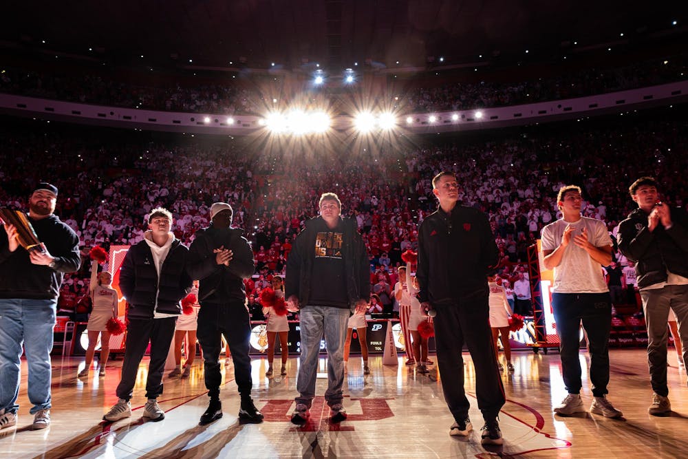 The Indiana football team and head coach Curt Cignetti walk onto the court before the men's basketball game against Purdue on Jan. 27, 2026, at Simon Skjodt Assembly Hall in Bloomington. The team celebrated its national title win with the fans before the game.