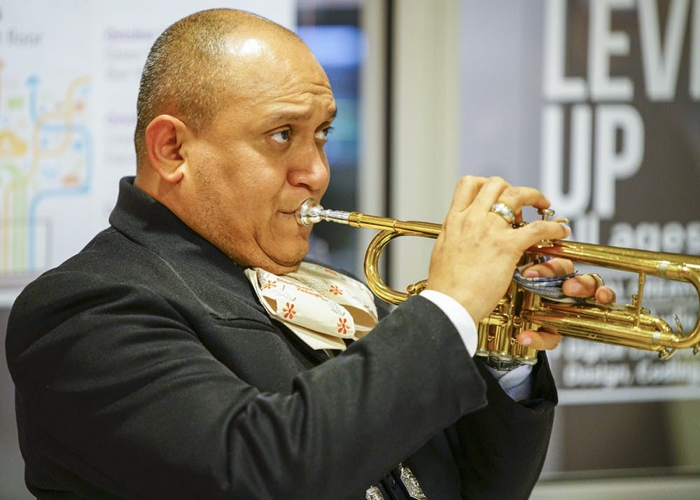 Alberto Molina of Mariachi Zelaya sings and plays trumpet during the Hispanic Heritage Day Celebration on Sunday afternoon in the Monroe County Public Library. Andrew Williams