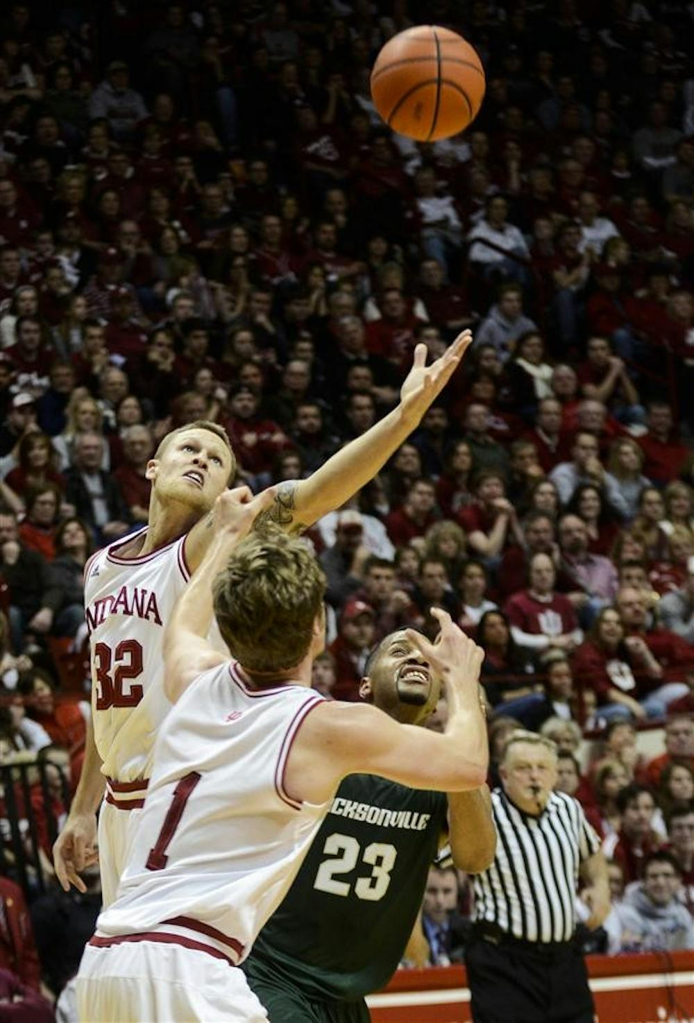 Senior guard Derek Elston and senior guard Jordan Hulls attempt to gain possesion of the ball during the Hoosiers' 93-59 win against Jacksonville on Friday at Assembly Hall.