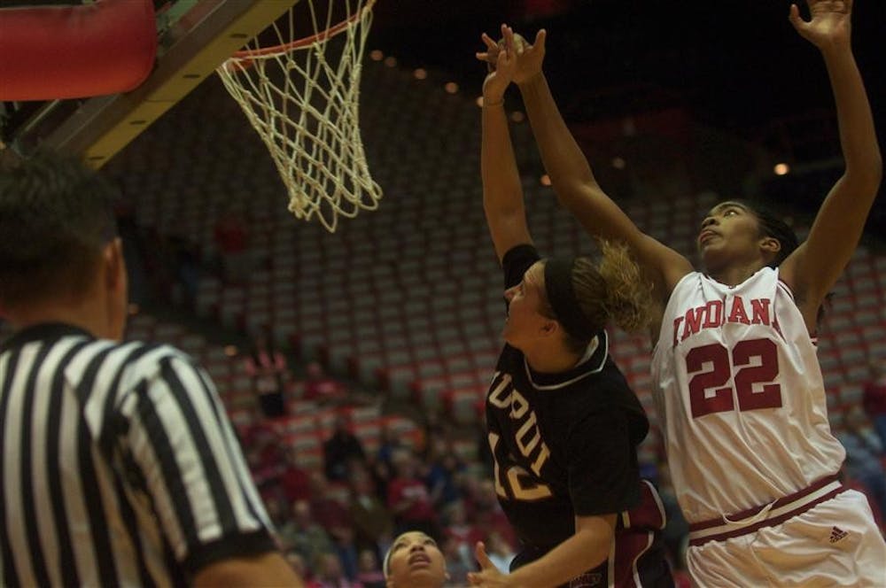 IU's Sasha Chaplin goes up for a rebound during the first half of the Hoosiers' game against IU-Purdue University Indianapolis Sunday at Assembly Hall. Peter Stevenson