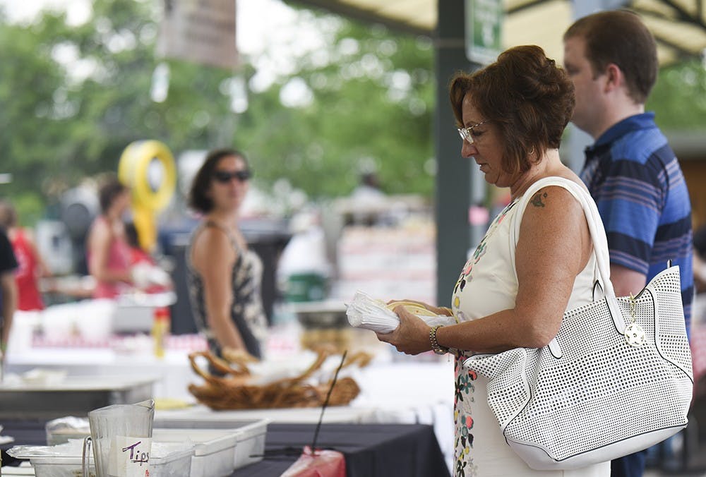 Sharon Mutuma buys a pork belly taco from Crazy Horse. Crazy Horse was one of the many Bloomington restaurants featured at Taste of Bloomington on Saturday. Rose Bythrow and Rose Bythrow and Rose Bythrow