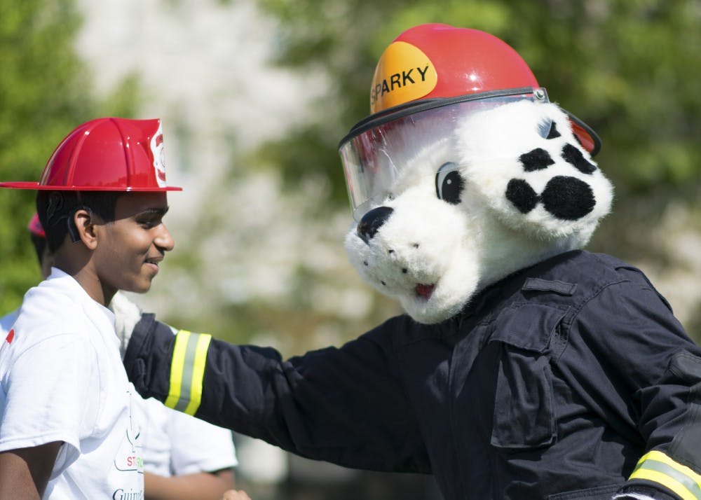Sparky the Fire Dog hugs freshman Teja Vontikommu at the Office of Insurance, Loss Control & Claims' organized attempt to break the world record of most simultaneous stop, drop and rolls. Participants entered a raffle to win prizes, and fireworks were set off after the attempted stop, drop and rolling.