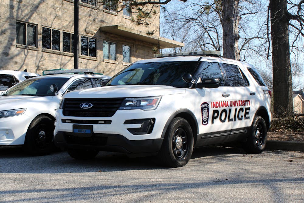 IUPD police cars sit at the IUPD station on March 5, 2023, on East 17th Street. An incident captured on video and shared online of an IU student pushing and mocking the accent of her Uber driver in October led to one arrest. Briana Pace