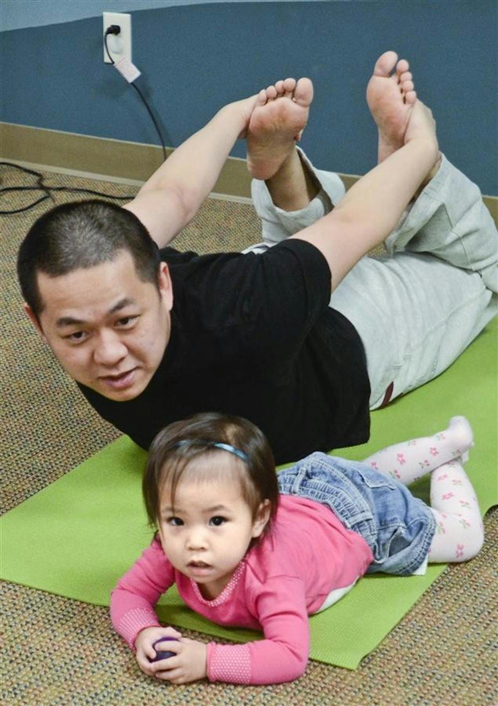 Shene Tung and his daughter Chiwa work on yoga poses during class. Toddler yoga class typically consists of doing animal poses, stretching and singing songs.