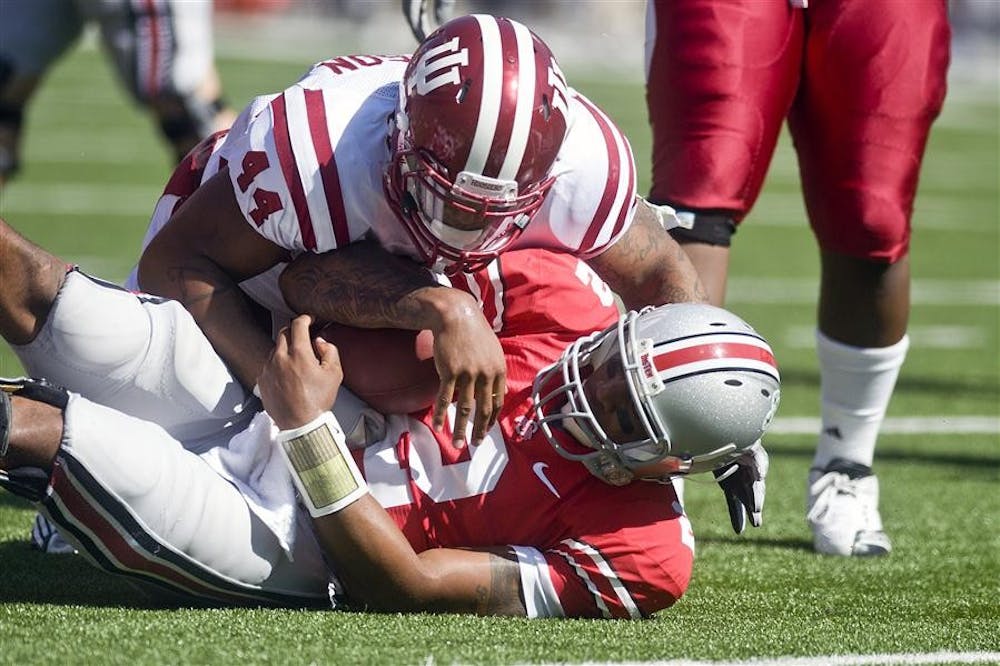 Ohio State quarterback Terrelle Pryor is tackled by defensive end Darius Johnson during IU's game against the Buckeyes on Saturday in Columbus, Ohio.