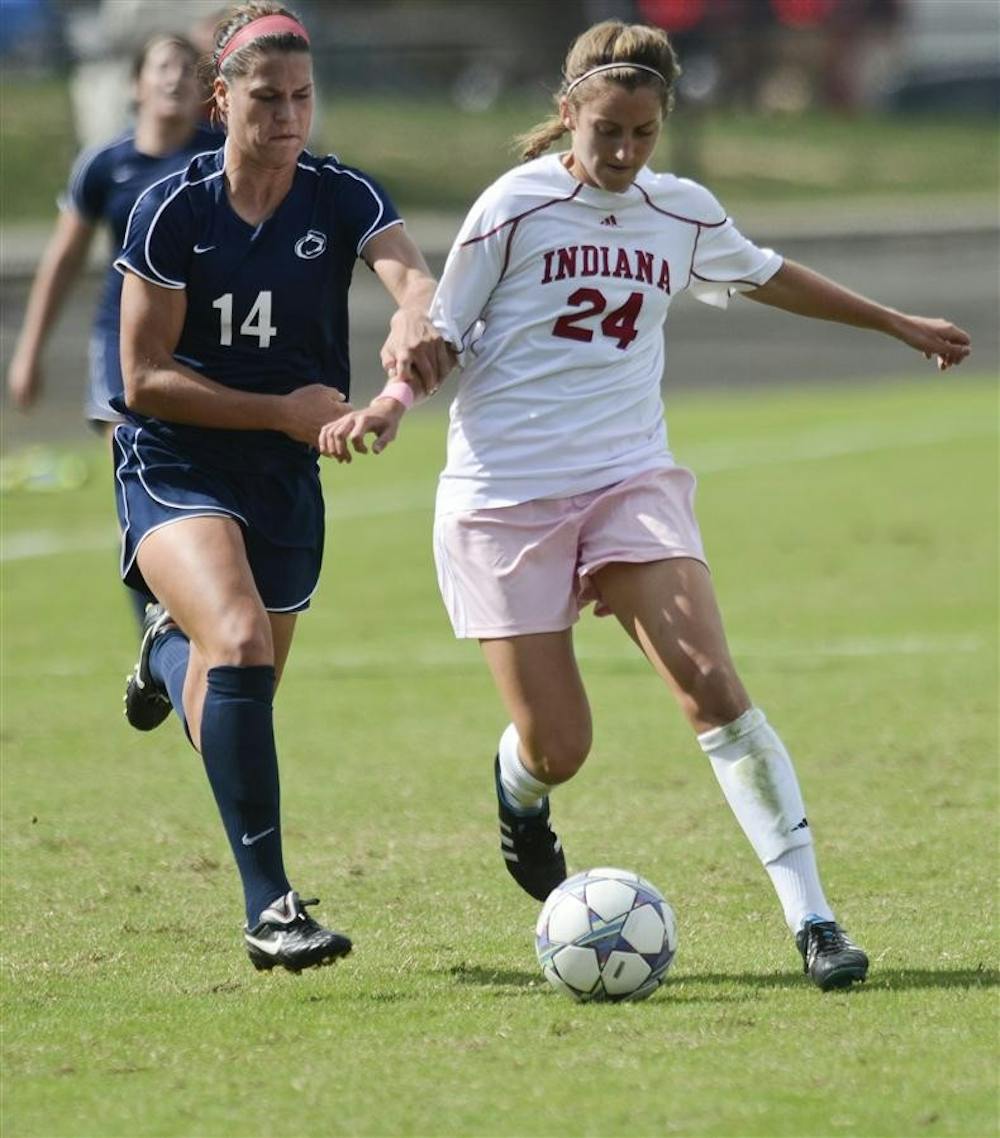 Freshman Kori Chapic of Penn attempts to pull back freshman midfielder Monica Melink as they fight for posession of the ball during the Hoosiers' 3-0 loss to Penn Sunday at the Bill Armstrong Stadium. Steph Langan