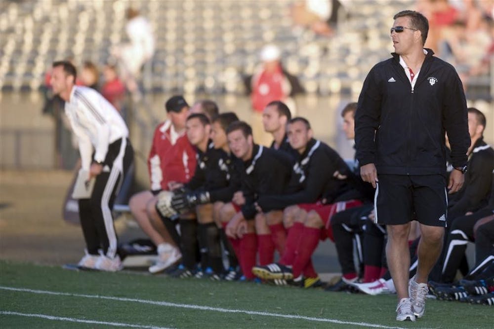IU coach Todd Yeagley yells out instructions during his first competitive home game as head coach of the Hoosiers on Friday at Bill Armstrong Stadium.