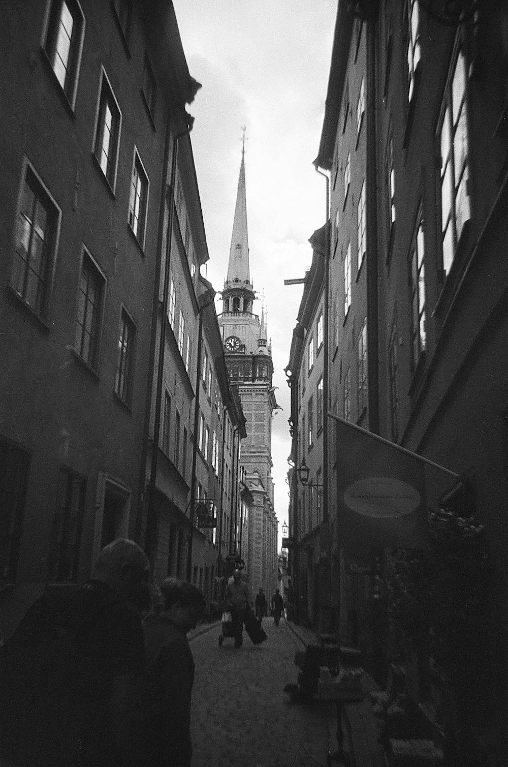 A clock tower is shown June 18, 2025, down a small street in Stockholm, Sweden. Columnist Sophie Albert shot the image using a Kodak Ultra F9 with 35 millimeter black-and-white film, giving the image more of an aged look.