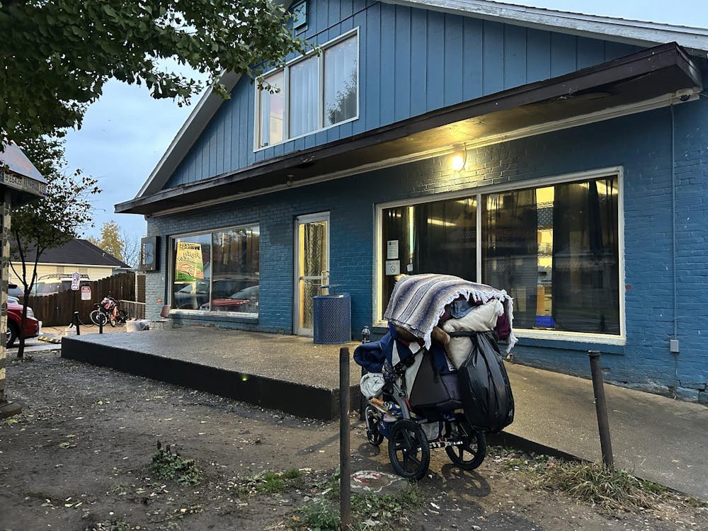 A stroller waits outside the Shalom Community Center on Oct. 30, 2025, in Bloomington. Shalom serves free breakfast every weekday from 8-9 a.m. Natalia Nelson