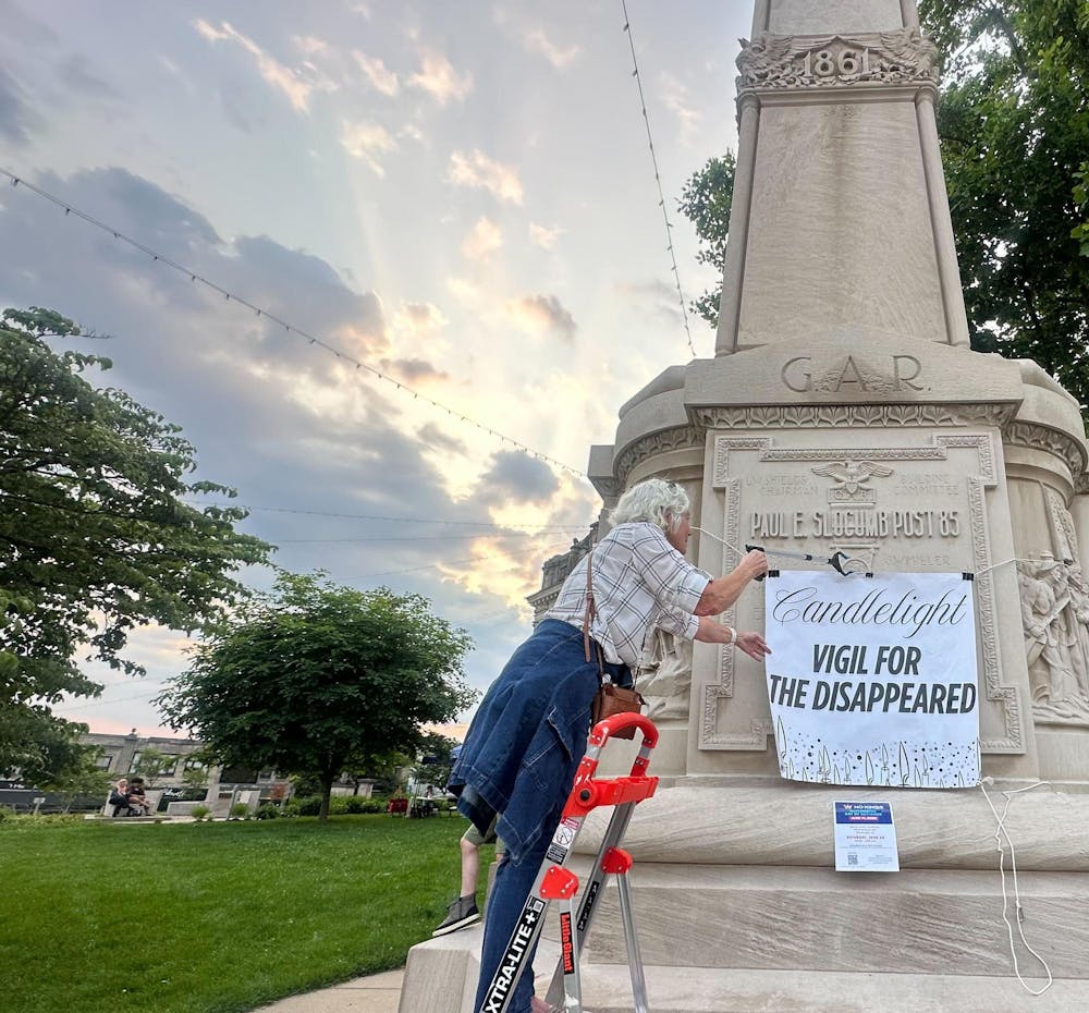 Protester Lori Stumpner hangs a sign reading "Vigil for the Disappeared" outside the Monroe County Courthouse. President Donald Trump invoked the Alien Enemies Act to authorize expedited deportations of certain migrants in March 2025.