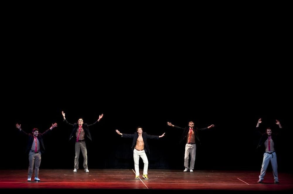 David Bleicher (center) of Phi Sigma Kappa dances to a medley of boy band music during BMOC Friday at the IU Auditorium. Mark Felix