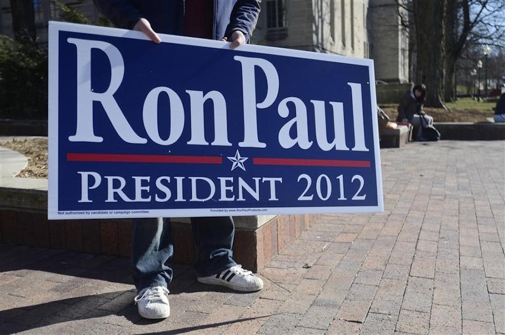 Youth for Ron Paul member sophomore Brad Miller holds up a Ron Paul sign Sunday at the Sample Gates. Steph Langan